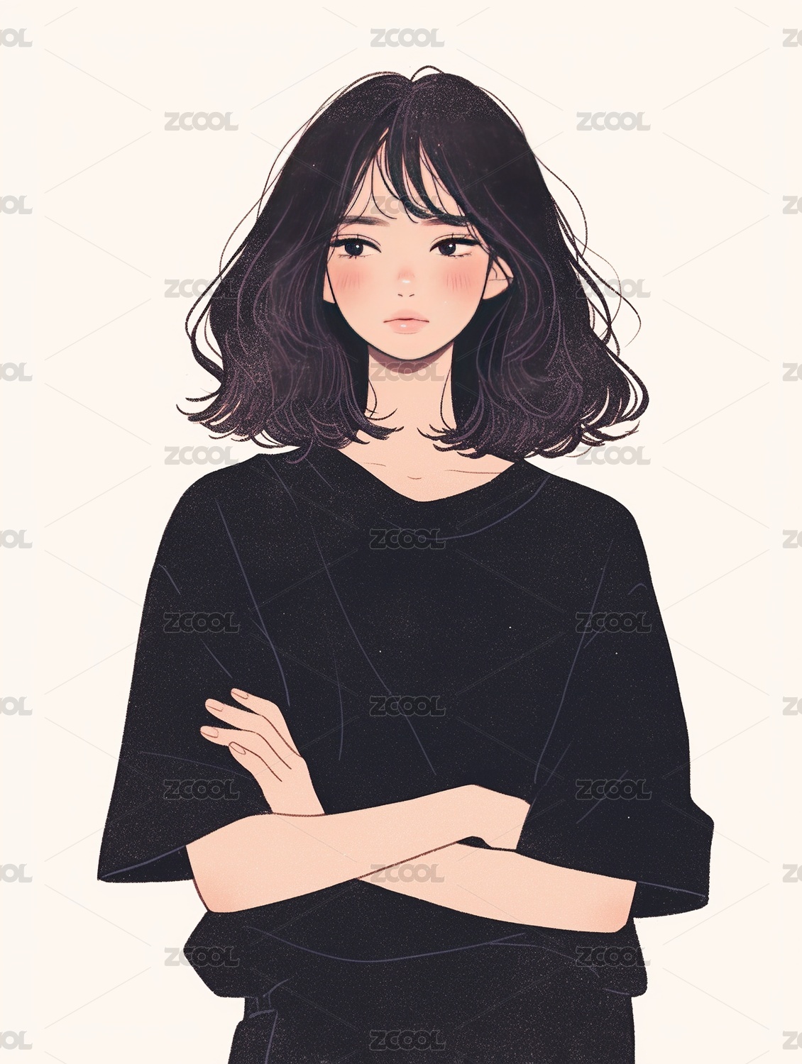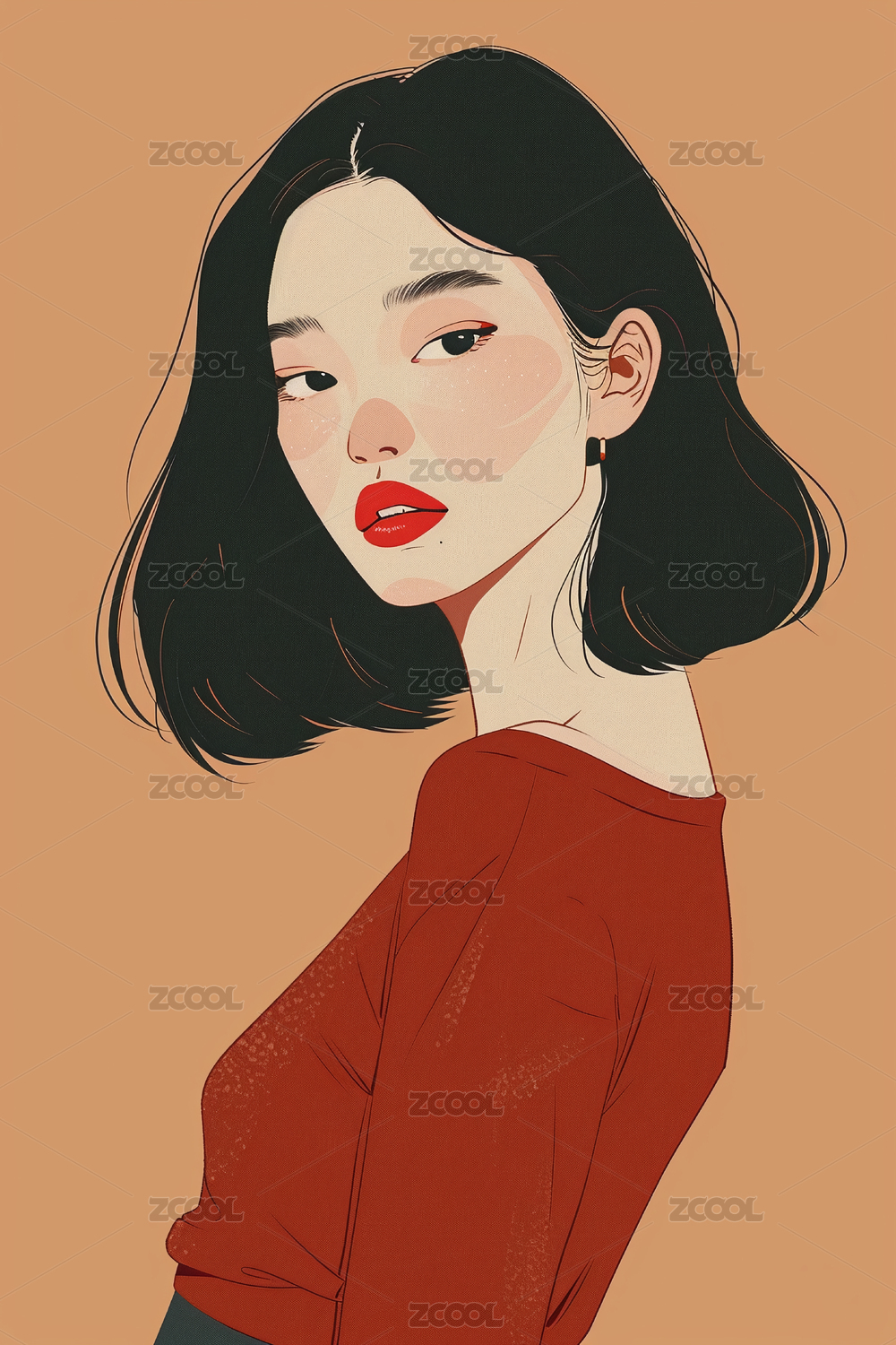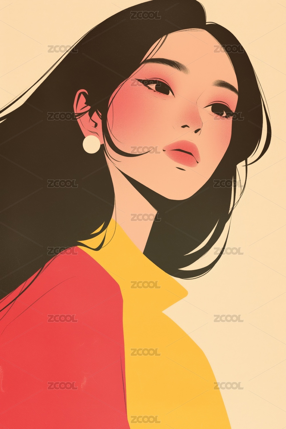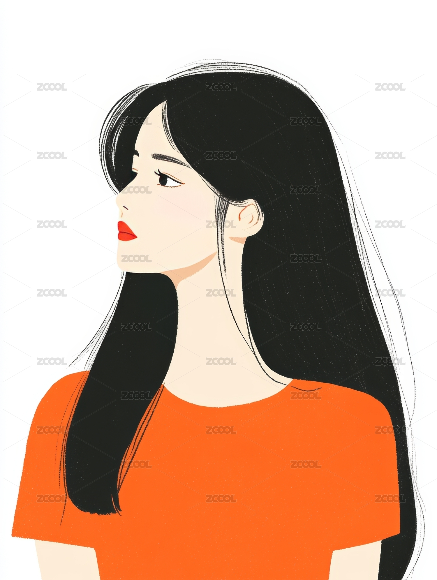 夏天黑头发黄皮肤东方女性头像扁平插画绘画