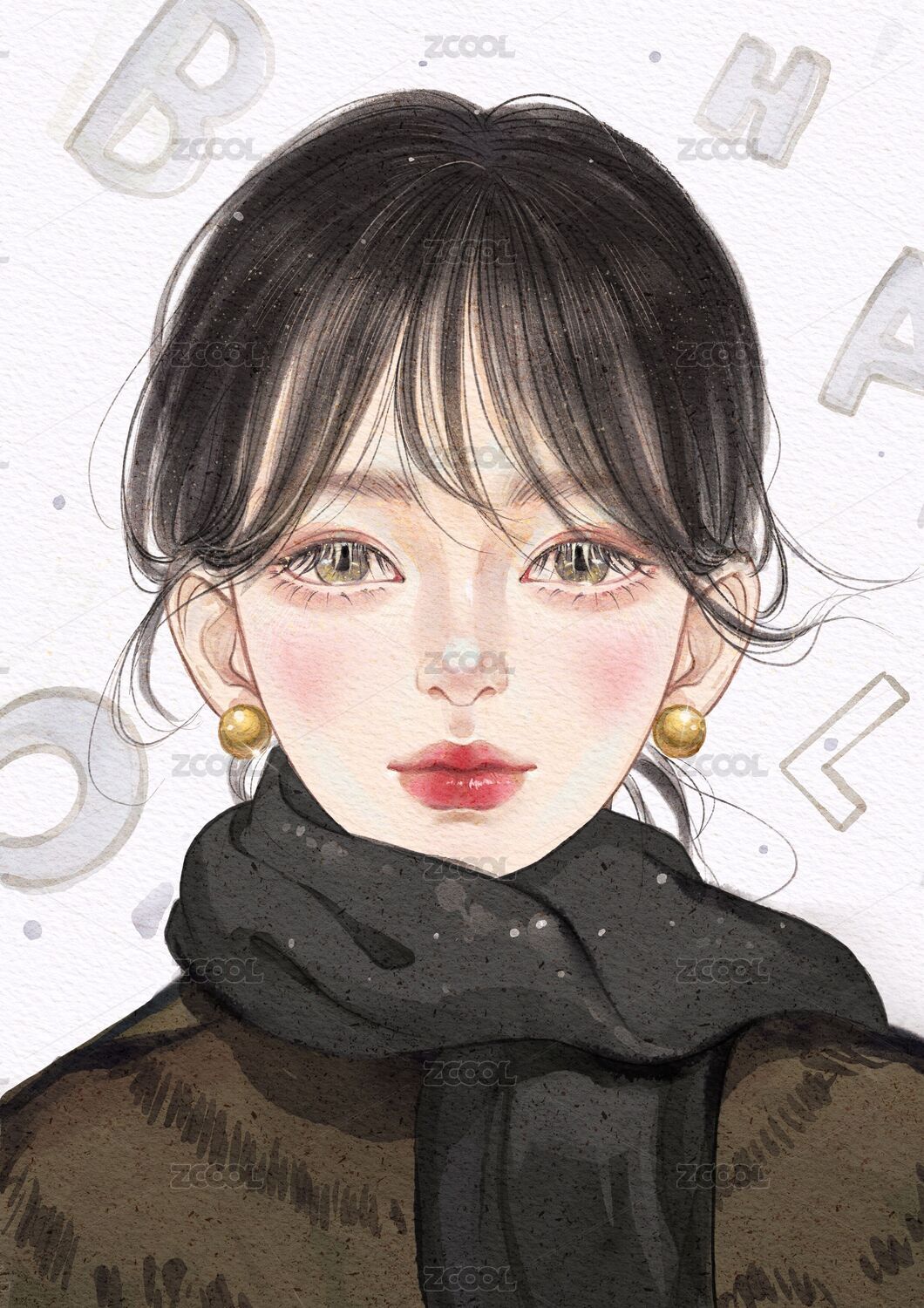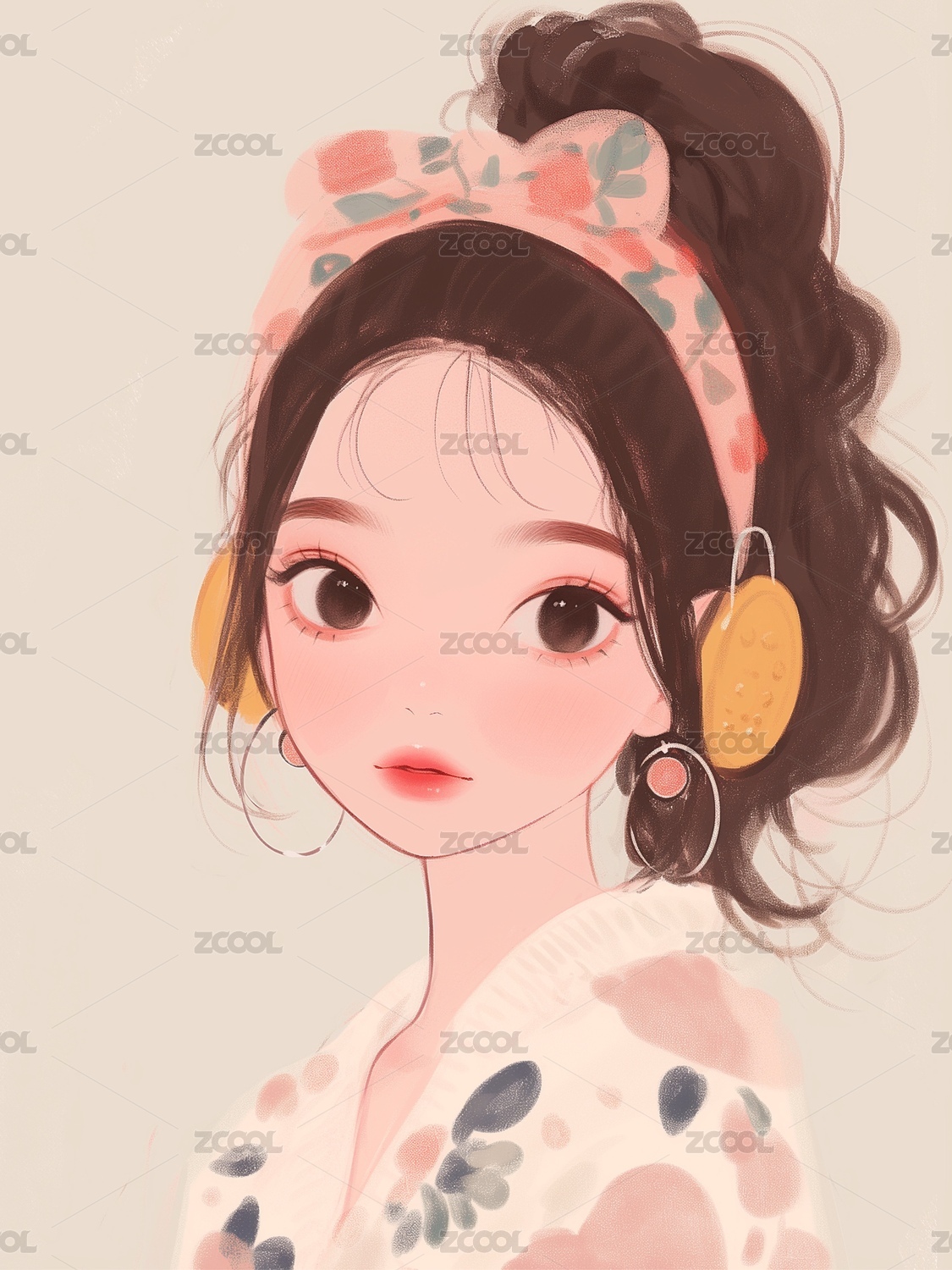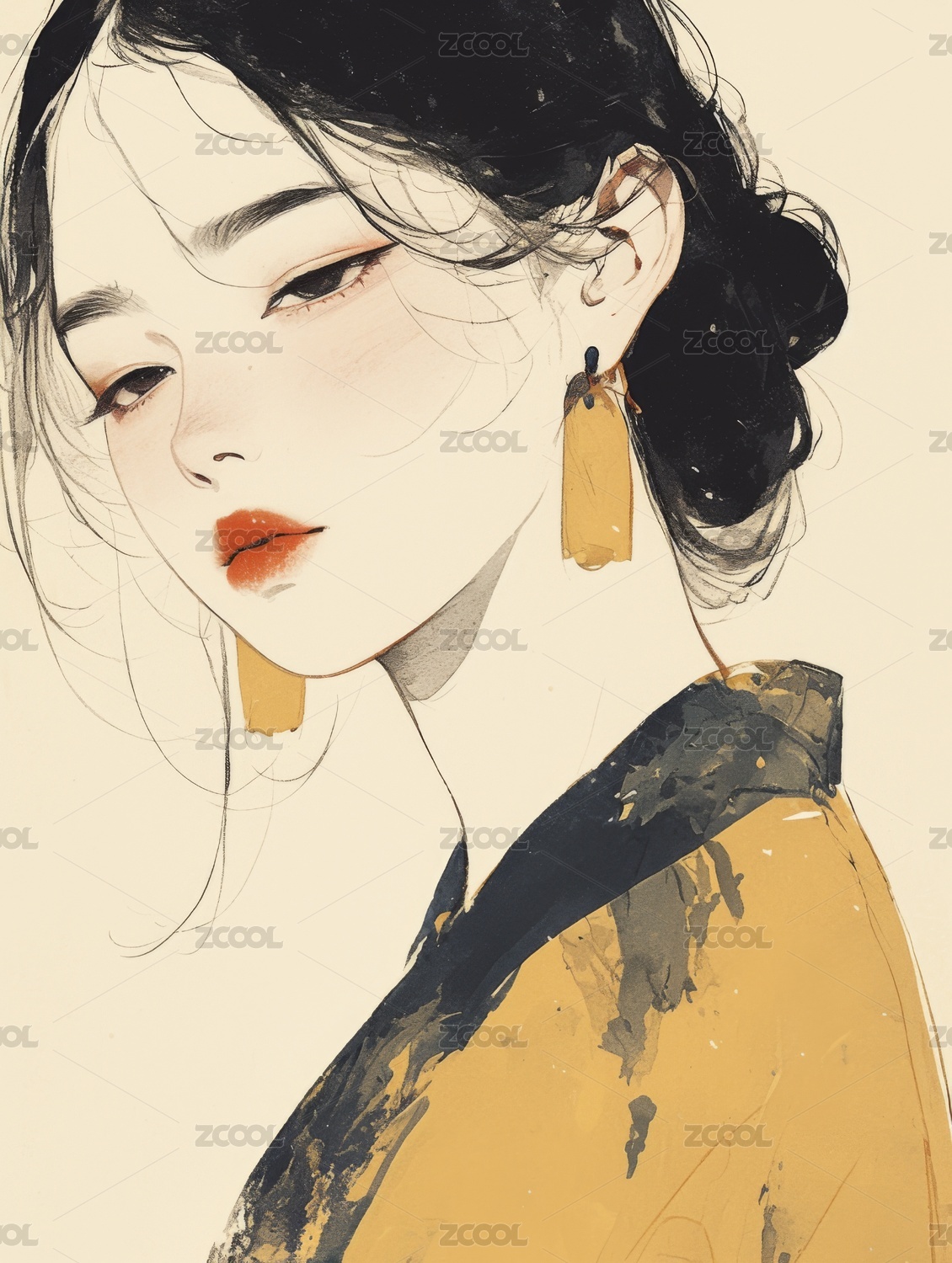 夏天黑头发黄皮肤东方女性头像扁平插画绘画