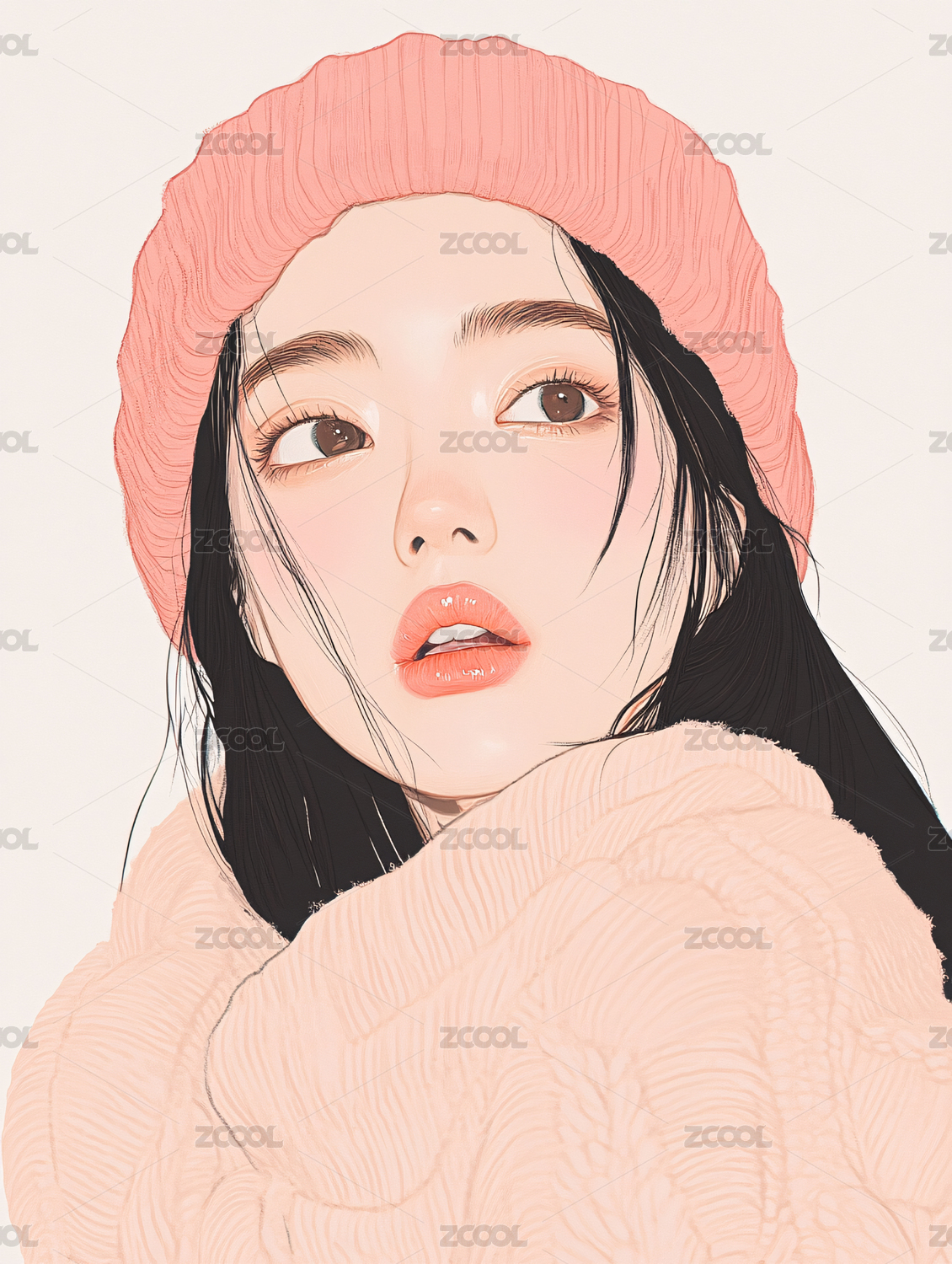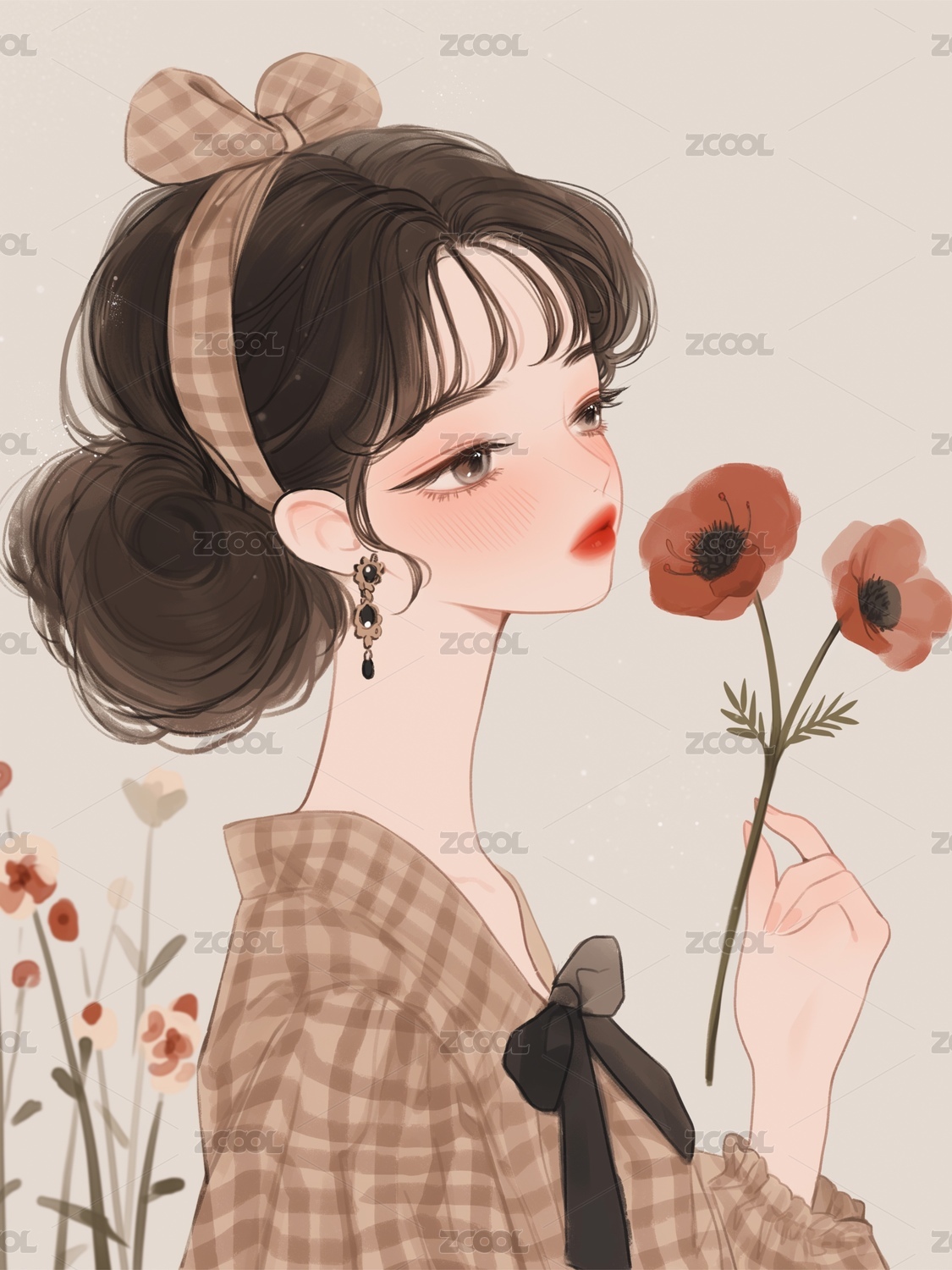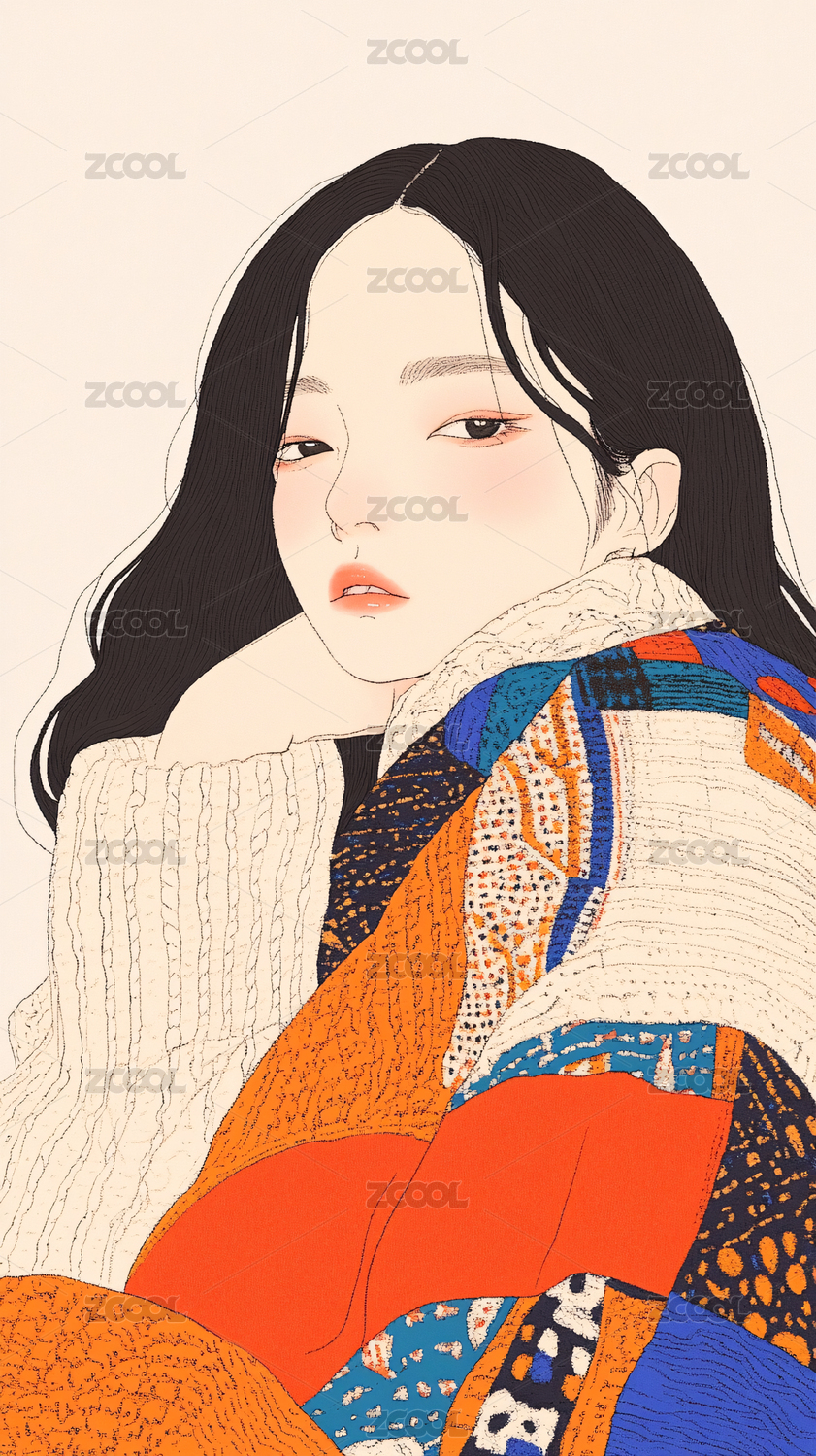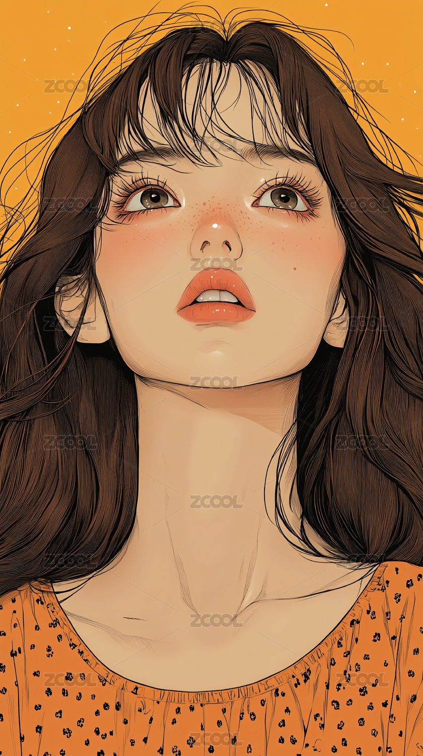 夏天黑头发黄皮肤东方女性头像扁平插画绘画