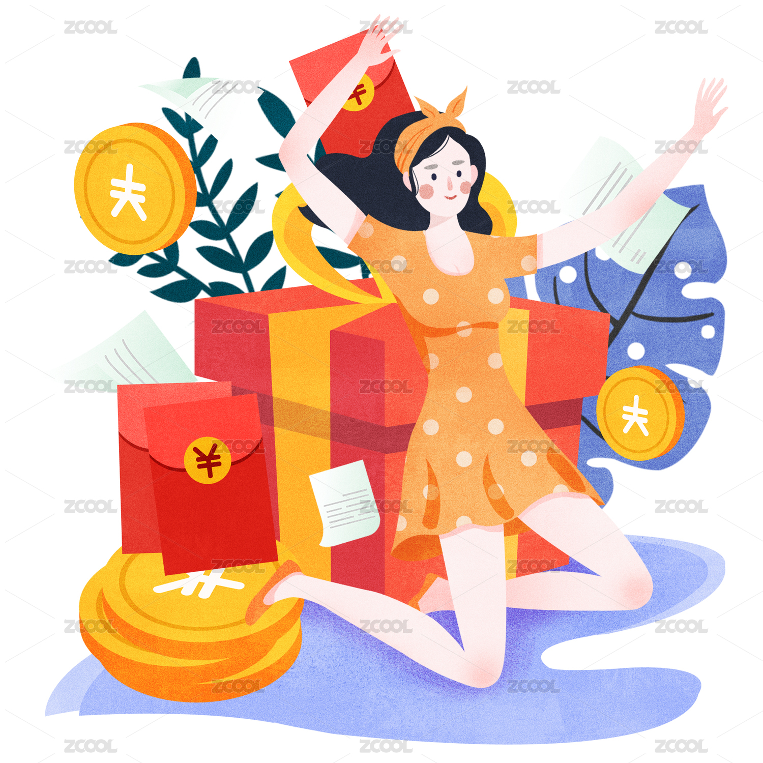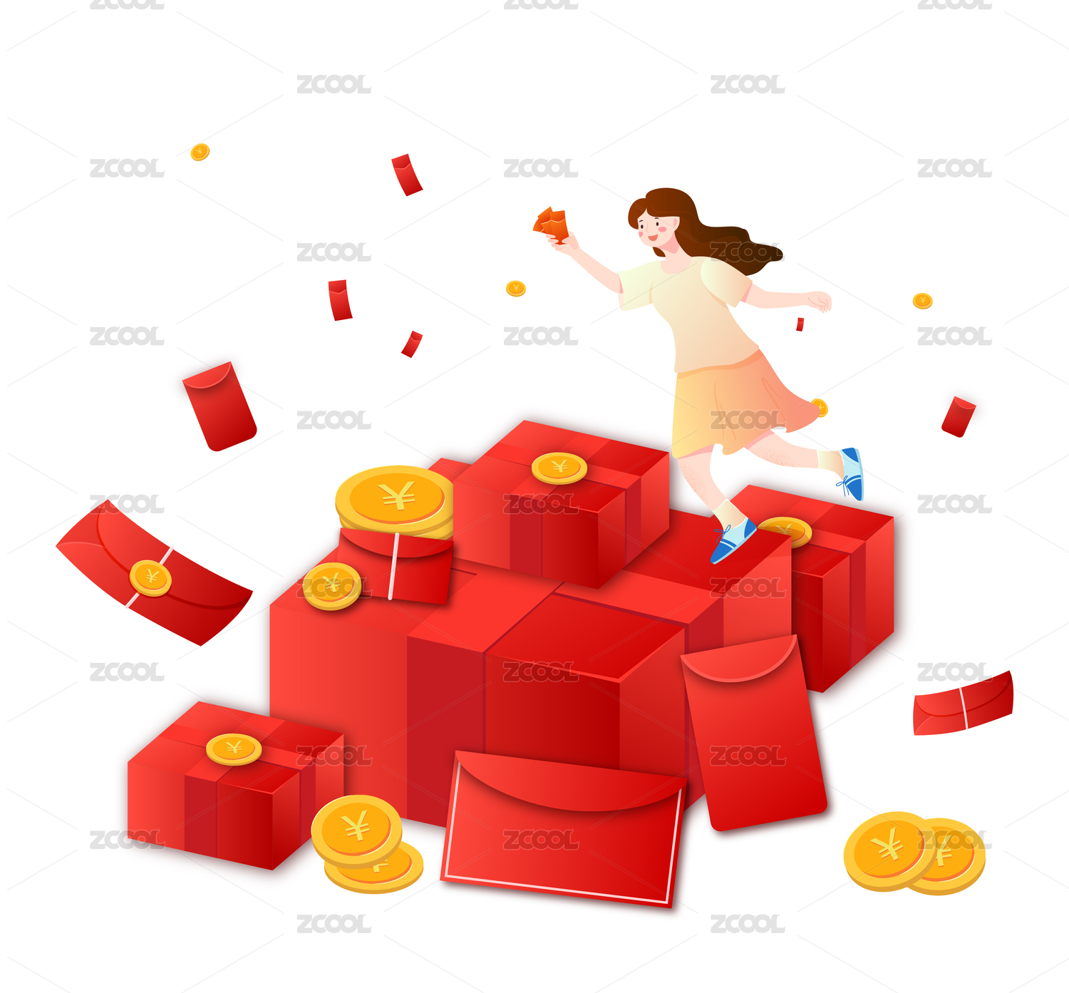 在礼盒和红包金币上奔跑的女性