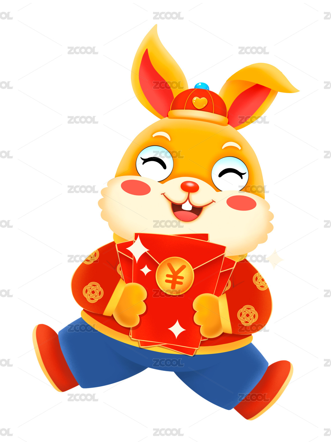 国潮新年兔年春节抱聚宝盆的兔子元素
