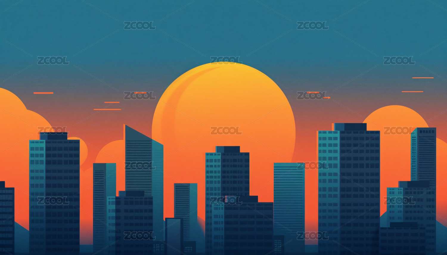 夕阳下的城市建筑矢量风格插画