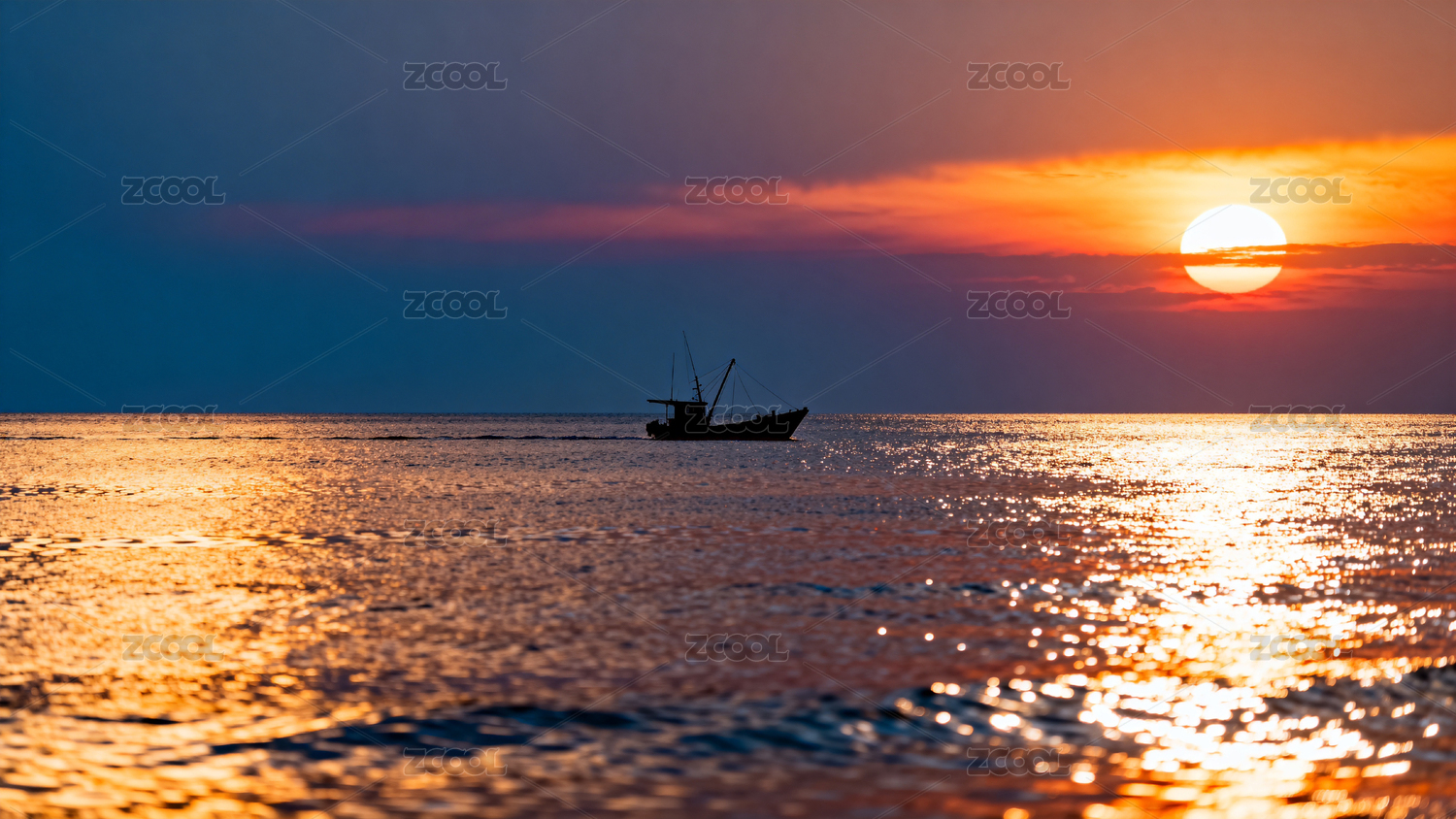 海上日落孤舟剪影