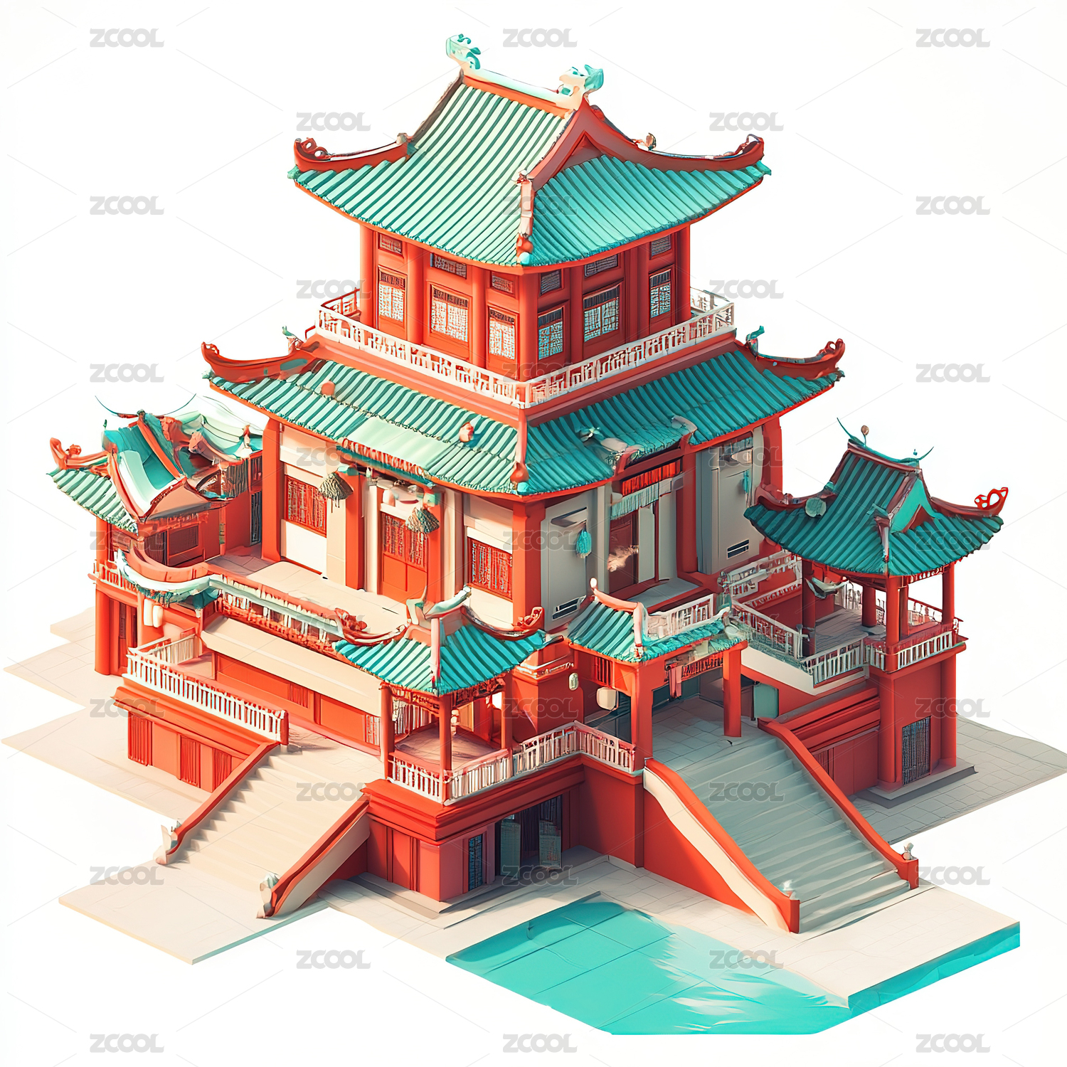 卡通三维中式古建筑插画