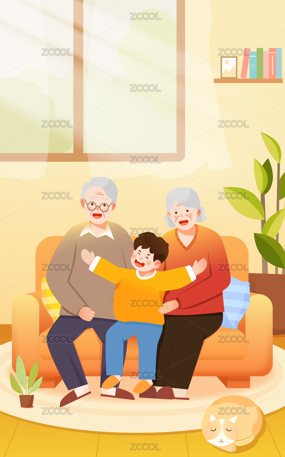 老年人夫妻在家中沙发上相拥 可爱风格重阳节老年人惬意生活插画