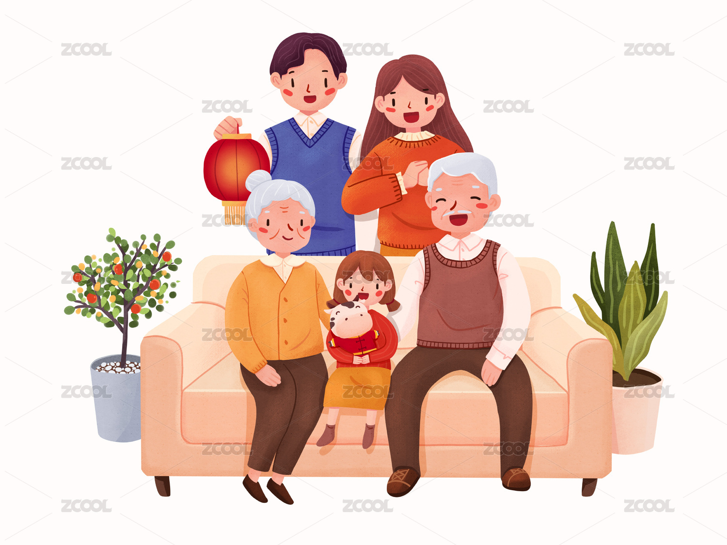 婚姻家庭关系一家五口人沙发花盆窗户漫