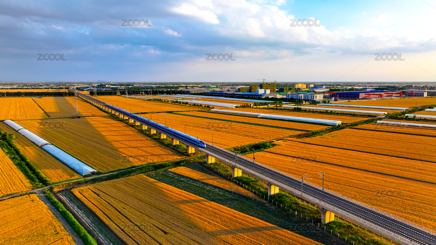 驰骋的高铁列车与村庄及麦田相映成趣