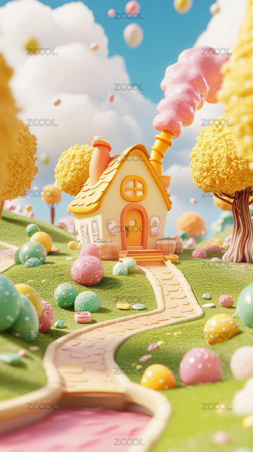 3D清新卡通风格草地上的房屋插画