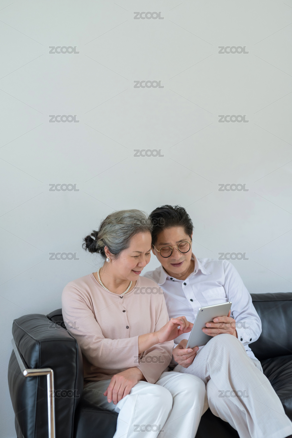 一对亚洲的老年夫妻在沙发上使用电子设备