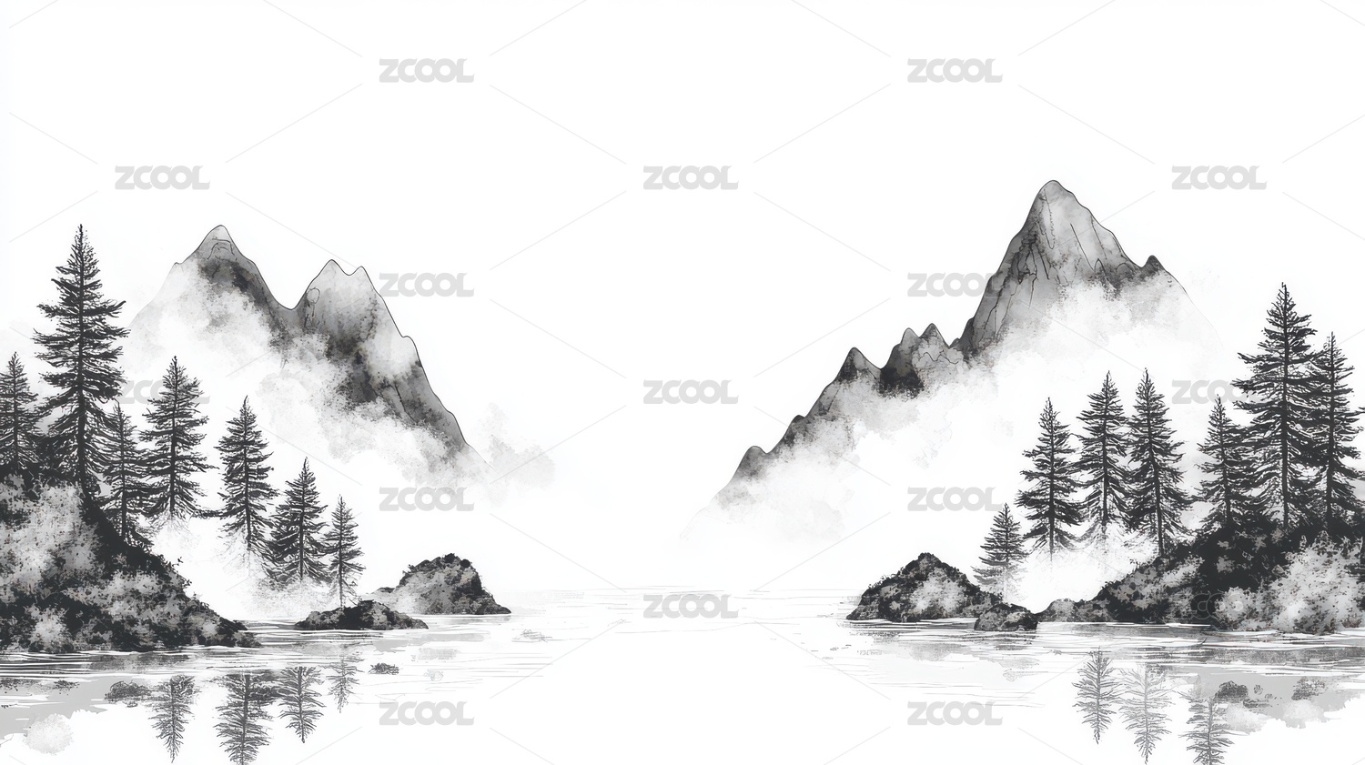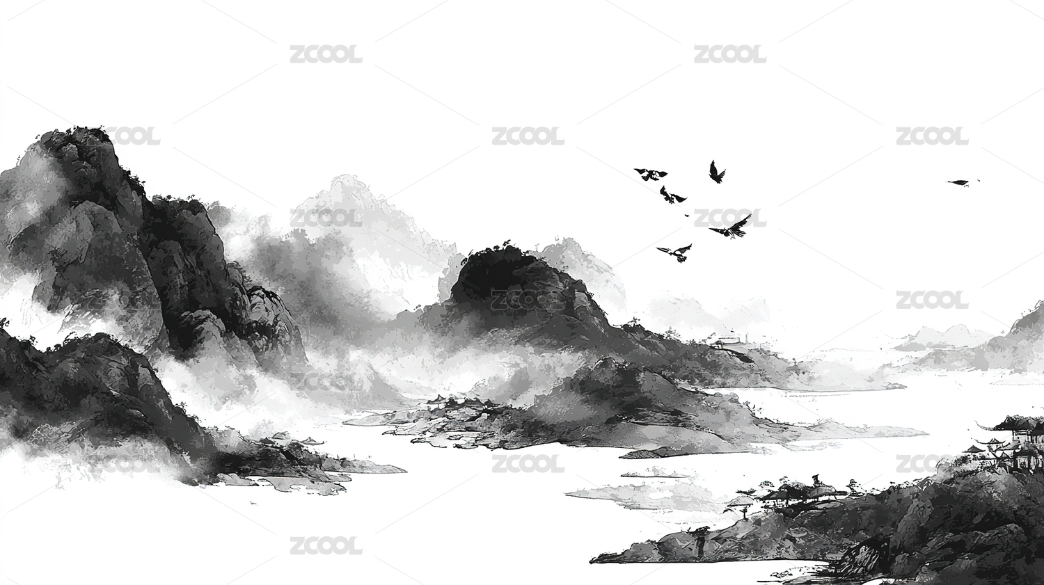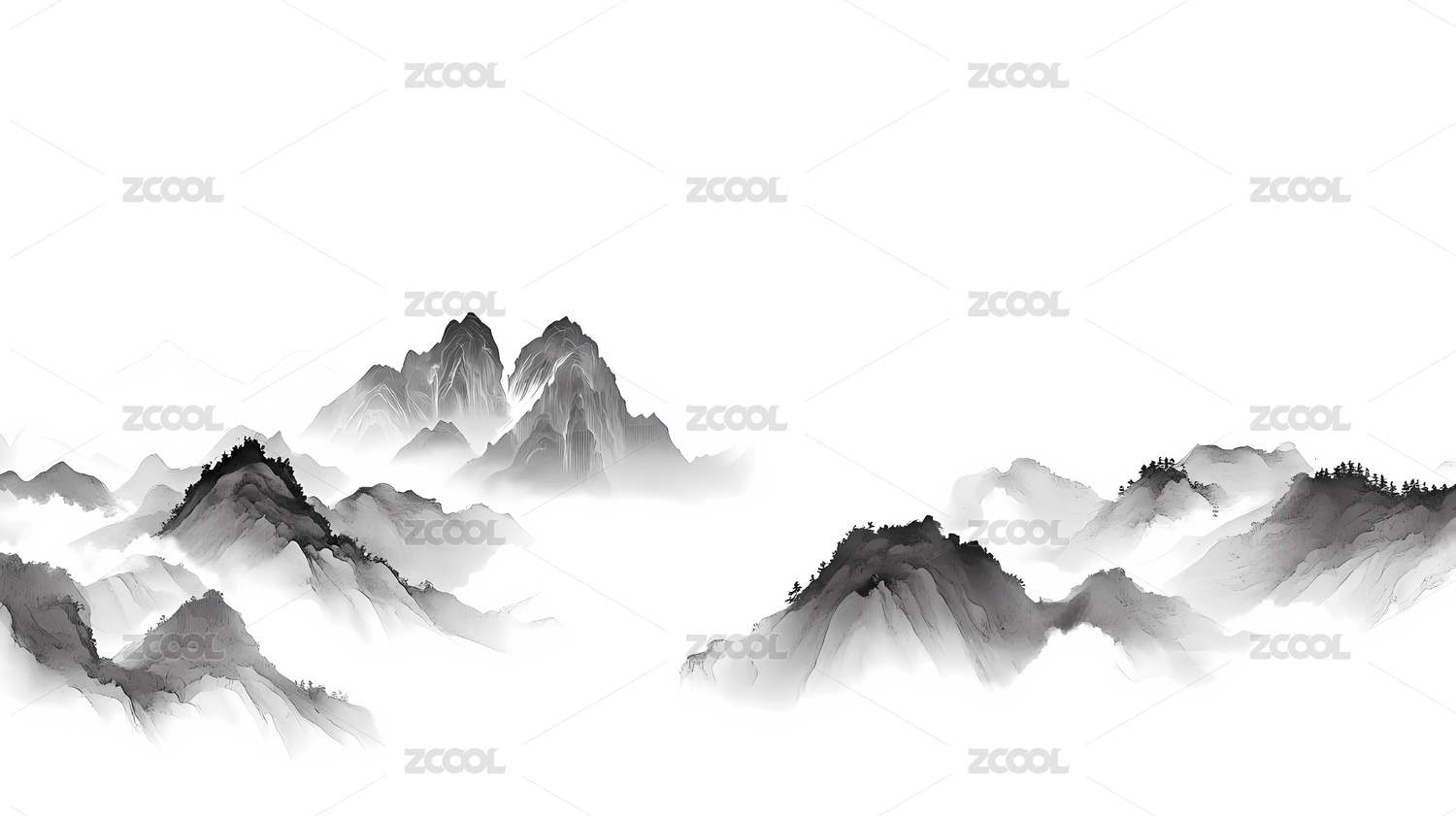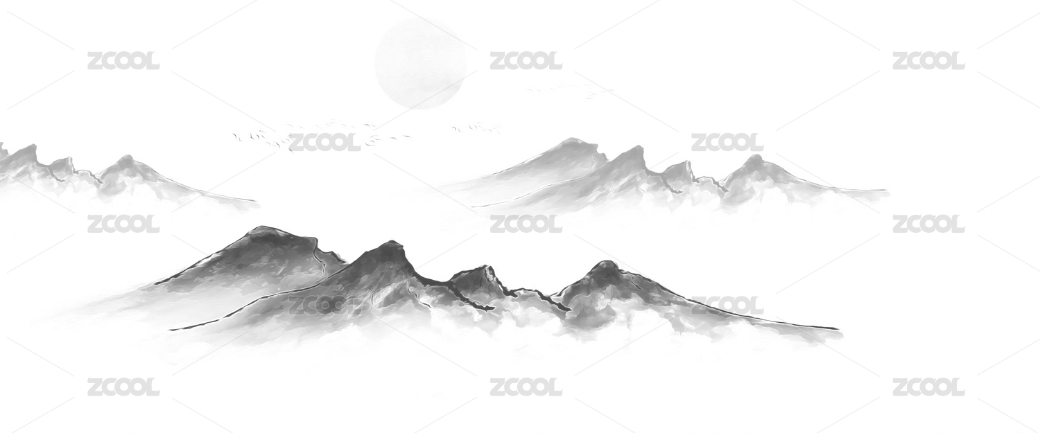 水墨画山峦云雾缭绕黑白分明