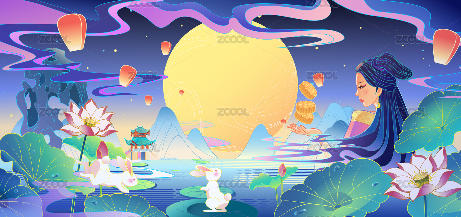 紫色背景下嫦娥美女中秋节手捧月饼插画