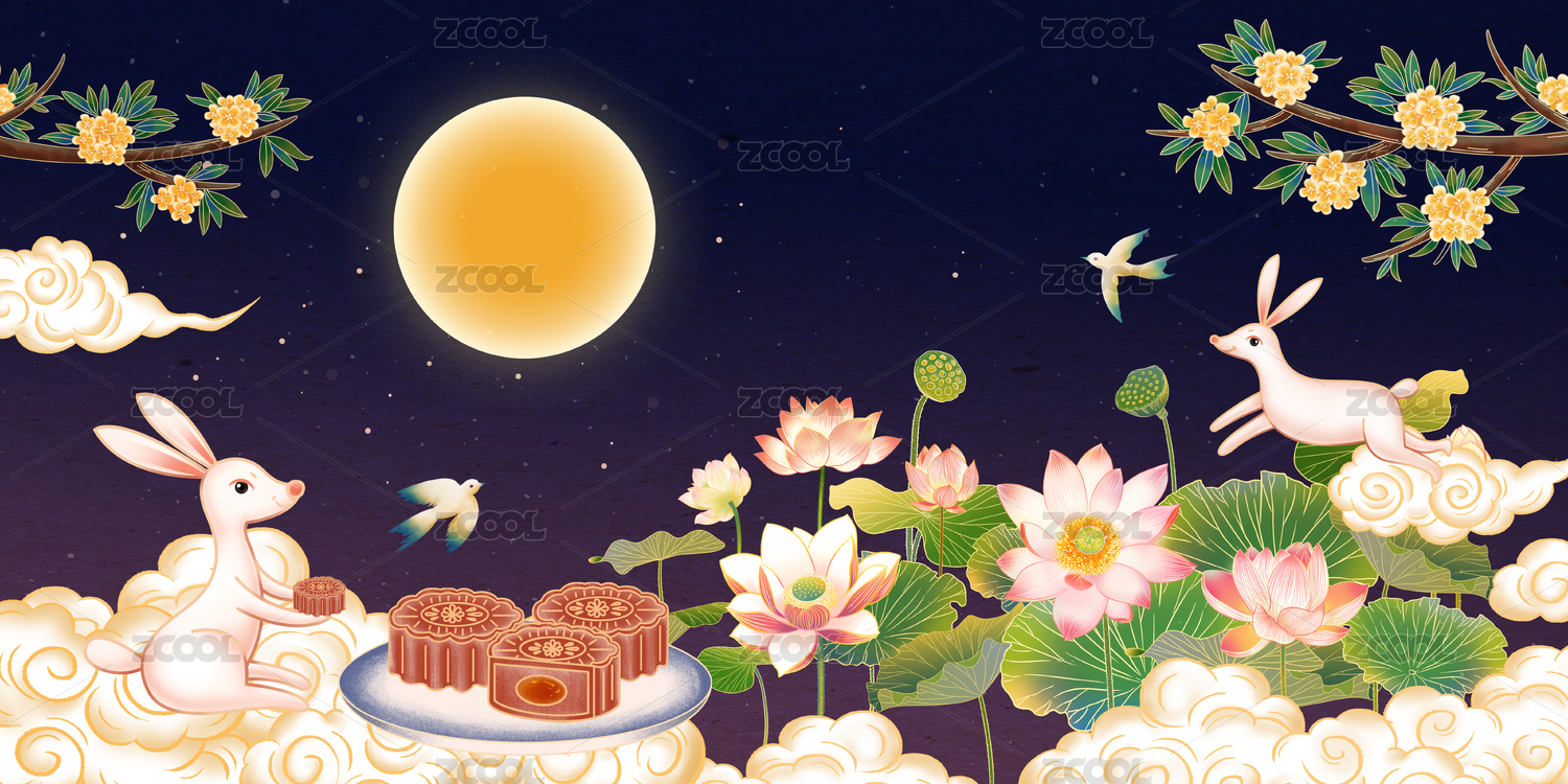 中国传统节日中秋节月亮荷花和兔子