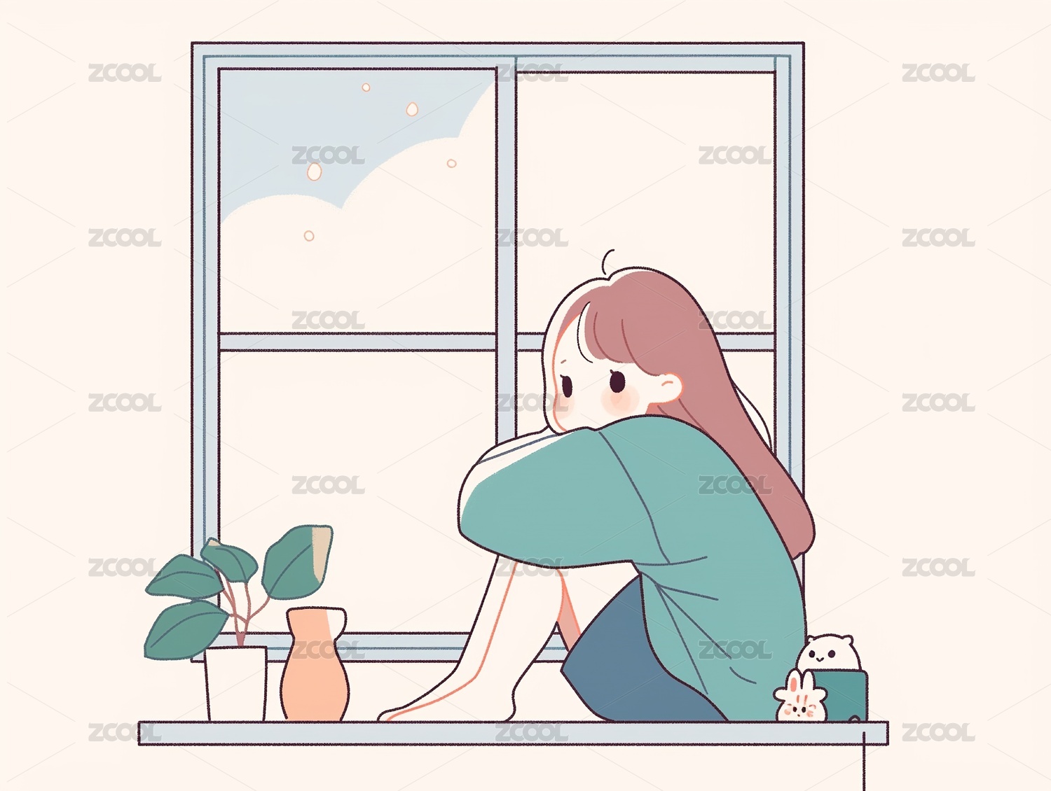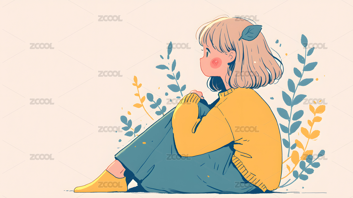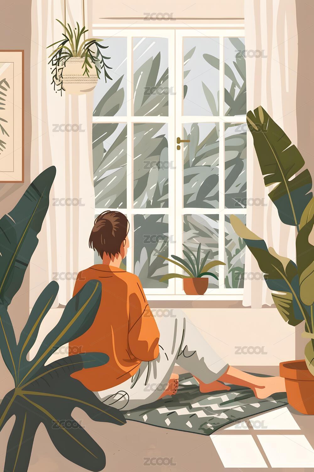 一个女生抱腿坐在地毯上望向远方思考旁边有琴叶榕和书,暖色调插画
