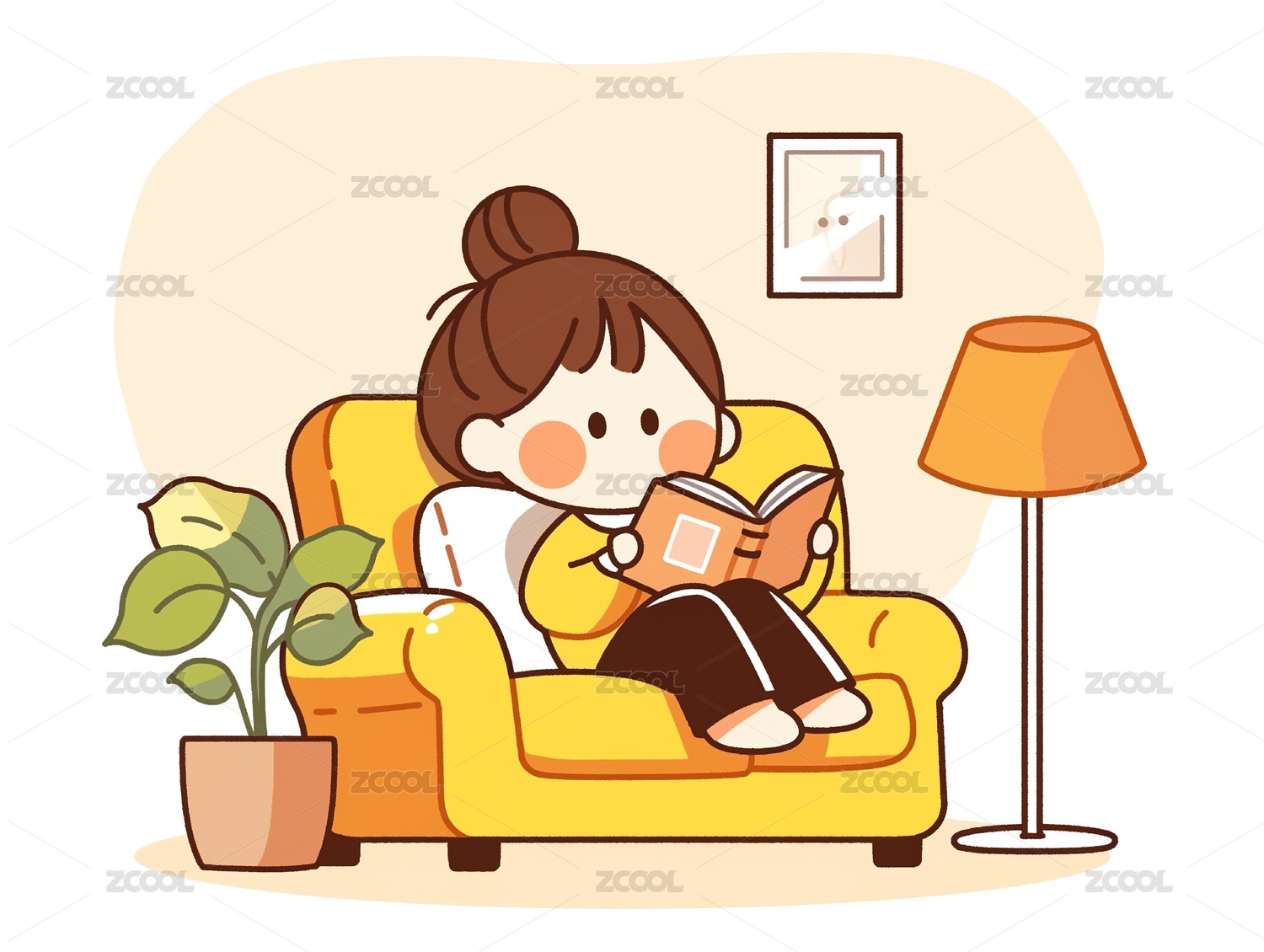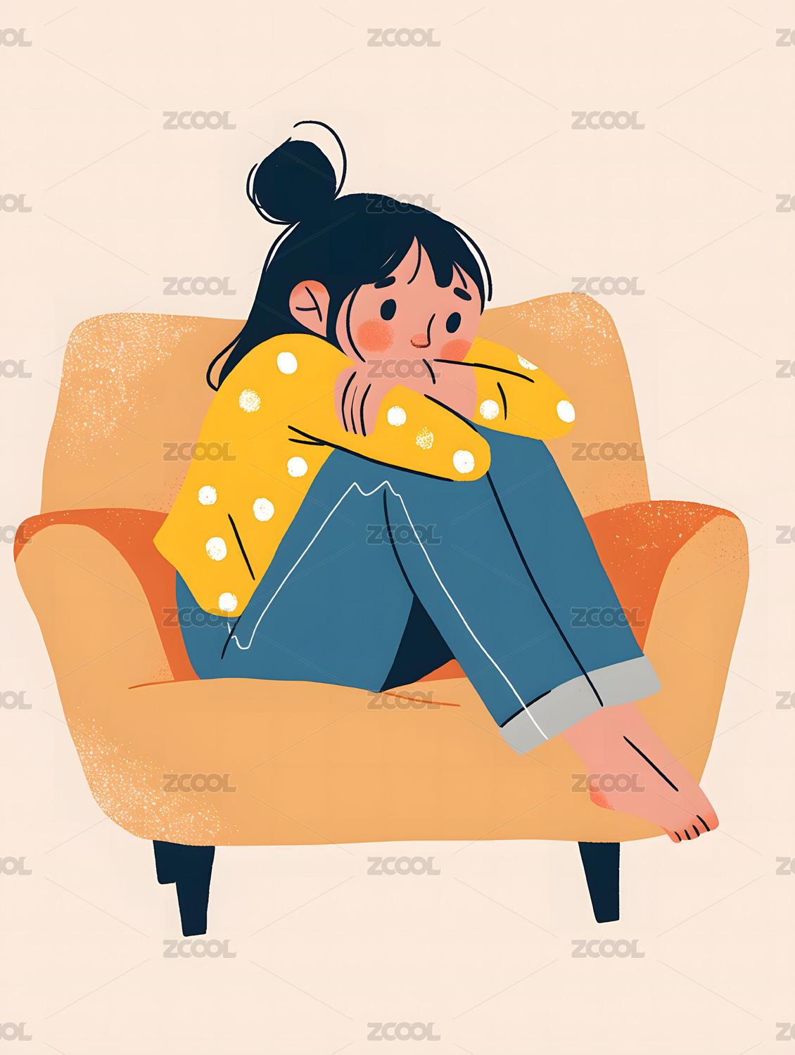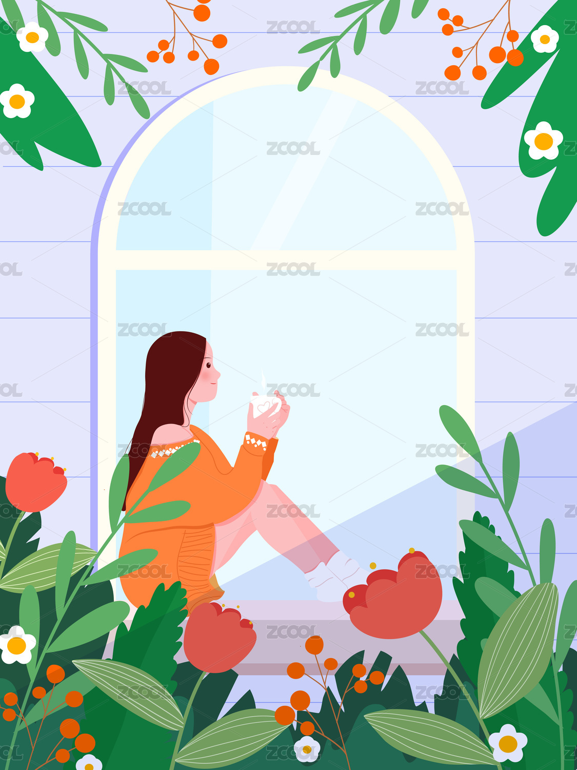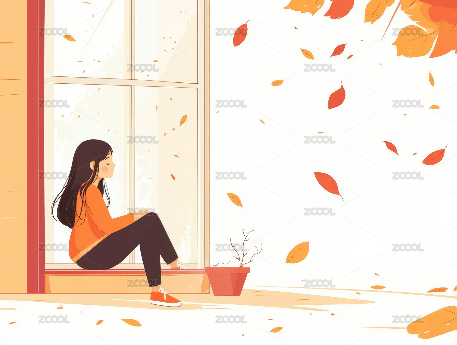 一个女生抱腿坐在地毯上望向远方思考旁边有琴叶榕和书,暖色调插画