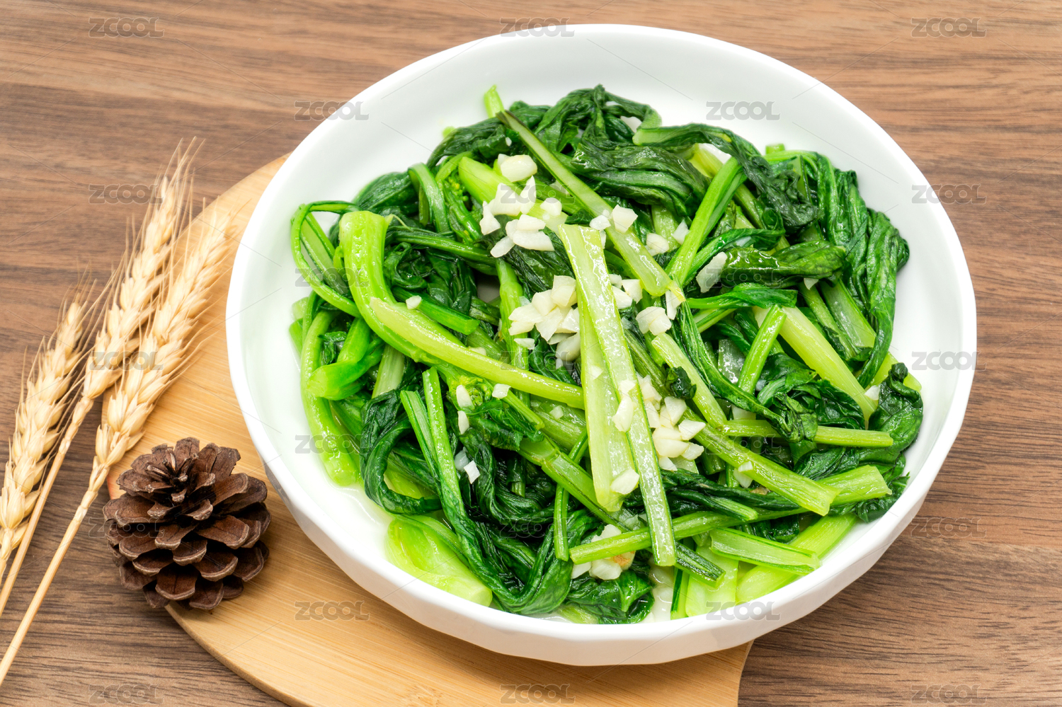 木桌背景一盘炒青菜蒜蓉炒菜心