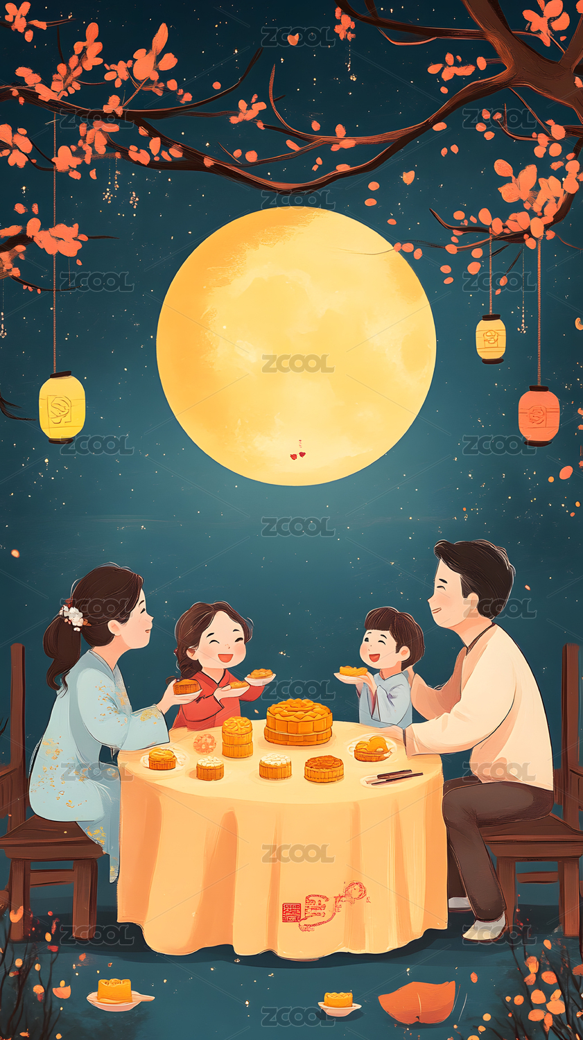 中秋节一家人吃团圆饭赏月吃饭聚餐美食插画