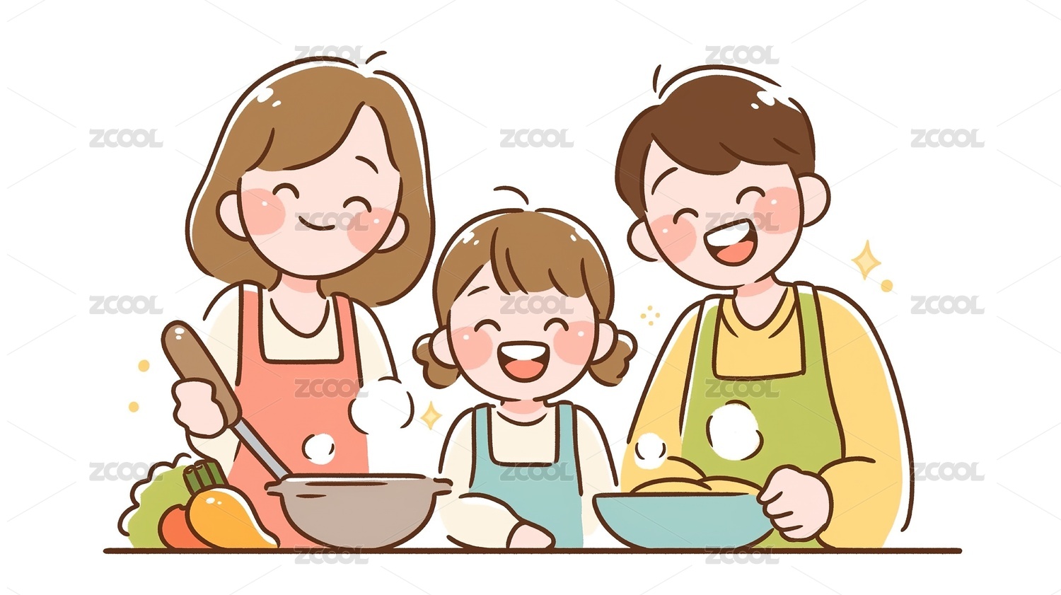 一家人在厨房一起做饭温馨画面手绘插画