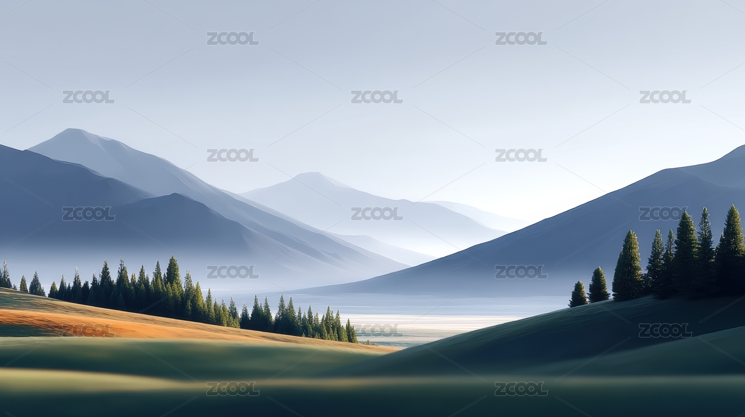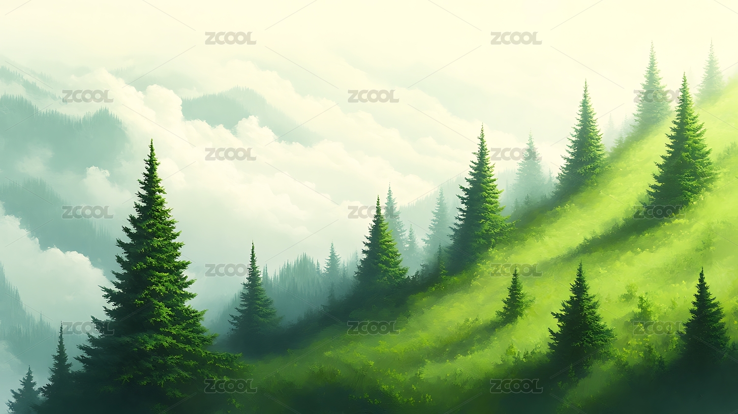 晨雾笼罩的层叠青翠松林与远山自然景观