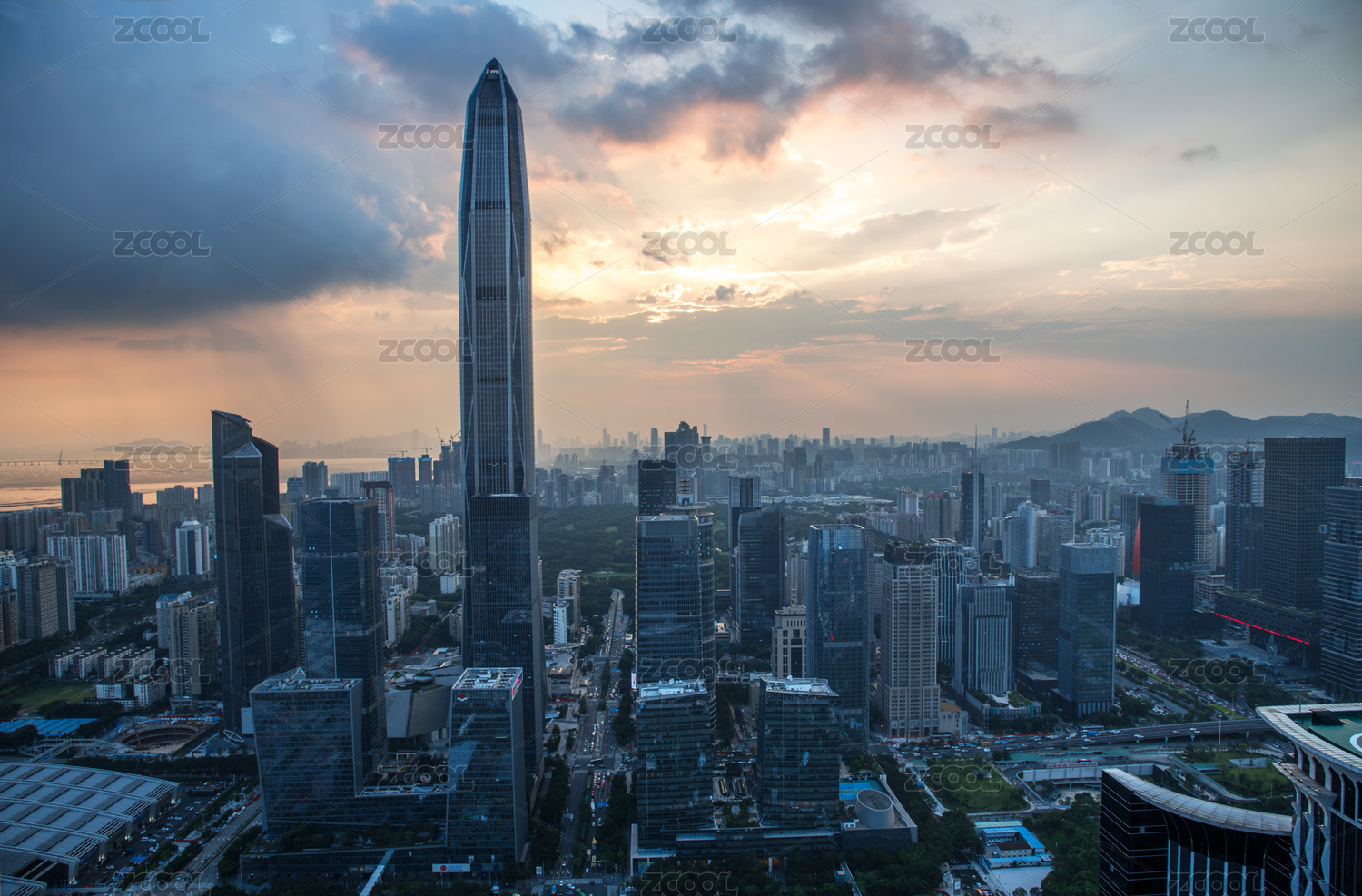 夕阳天空下的中国广东省深圳城市天际线建筑群高楼大厦风光