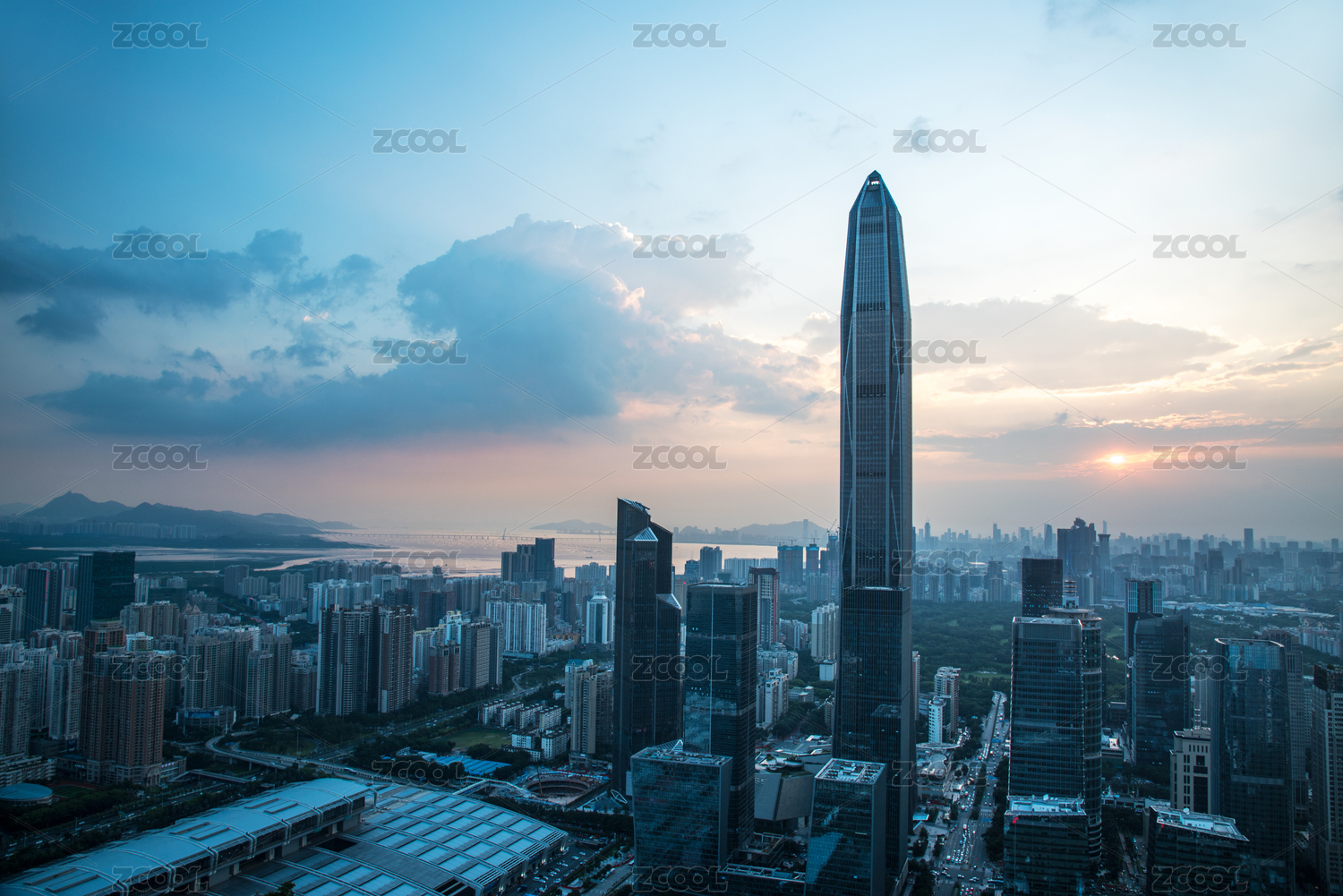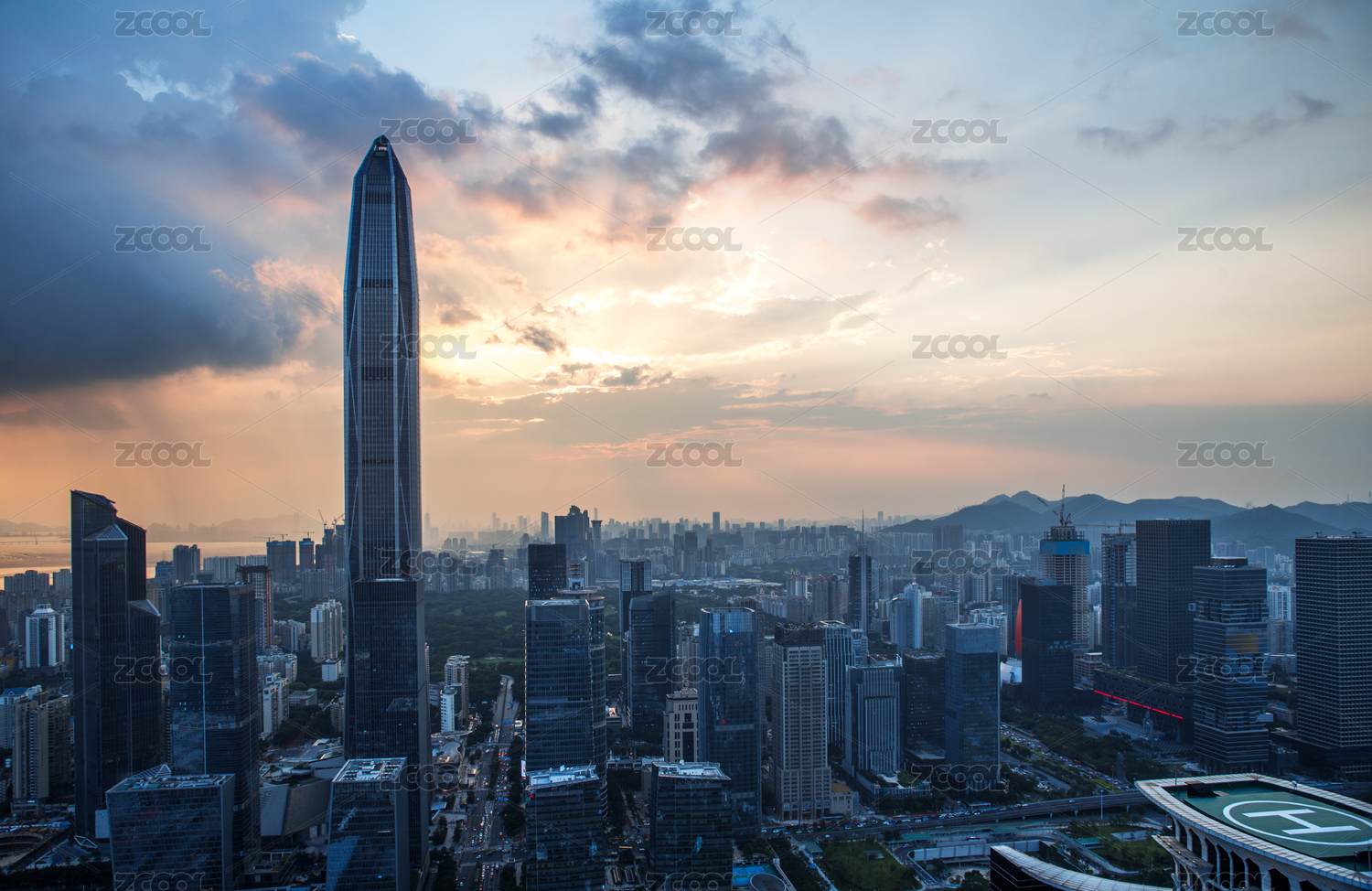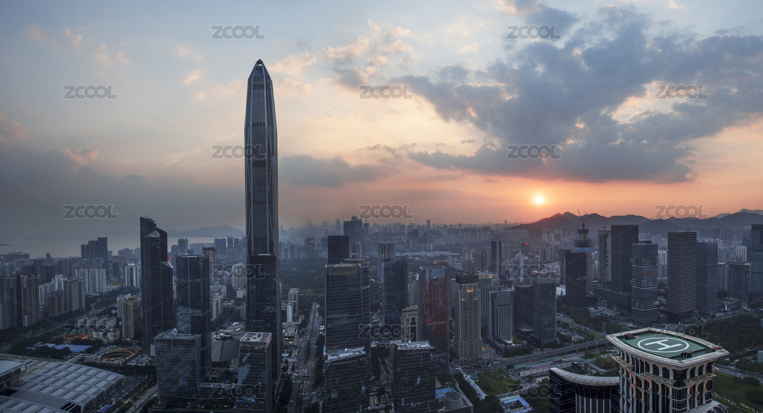 鸟瞰中国广东省深圳平安大厦天际线建筑群高楼大厦夕阳黄昏风光