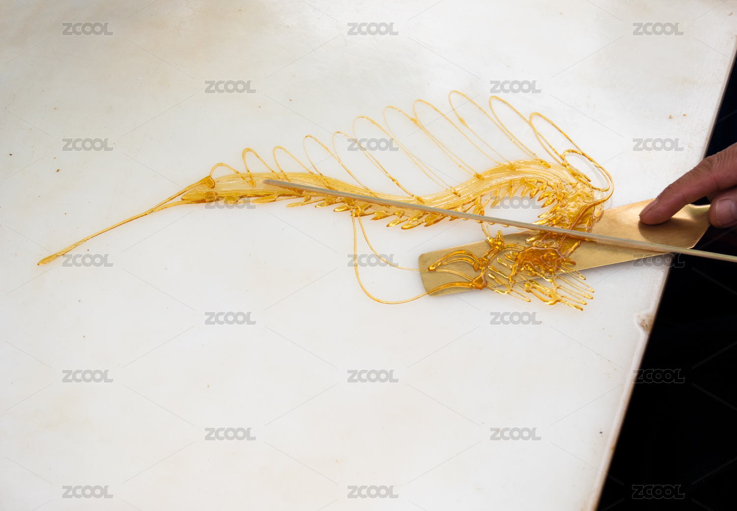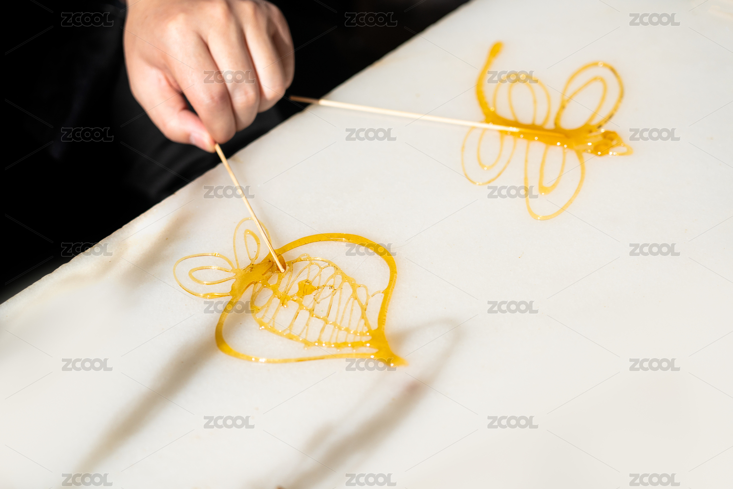 正在白色汉白玉石板上用铁勺乘黄色糖汁绘制的中国民间传统糖画