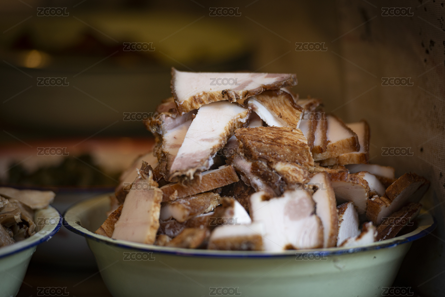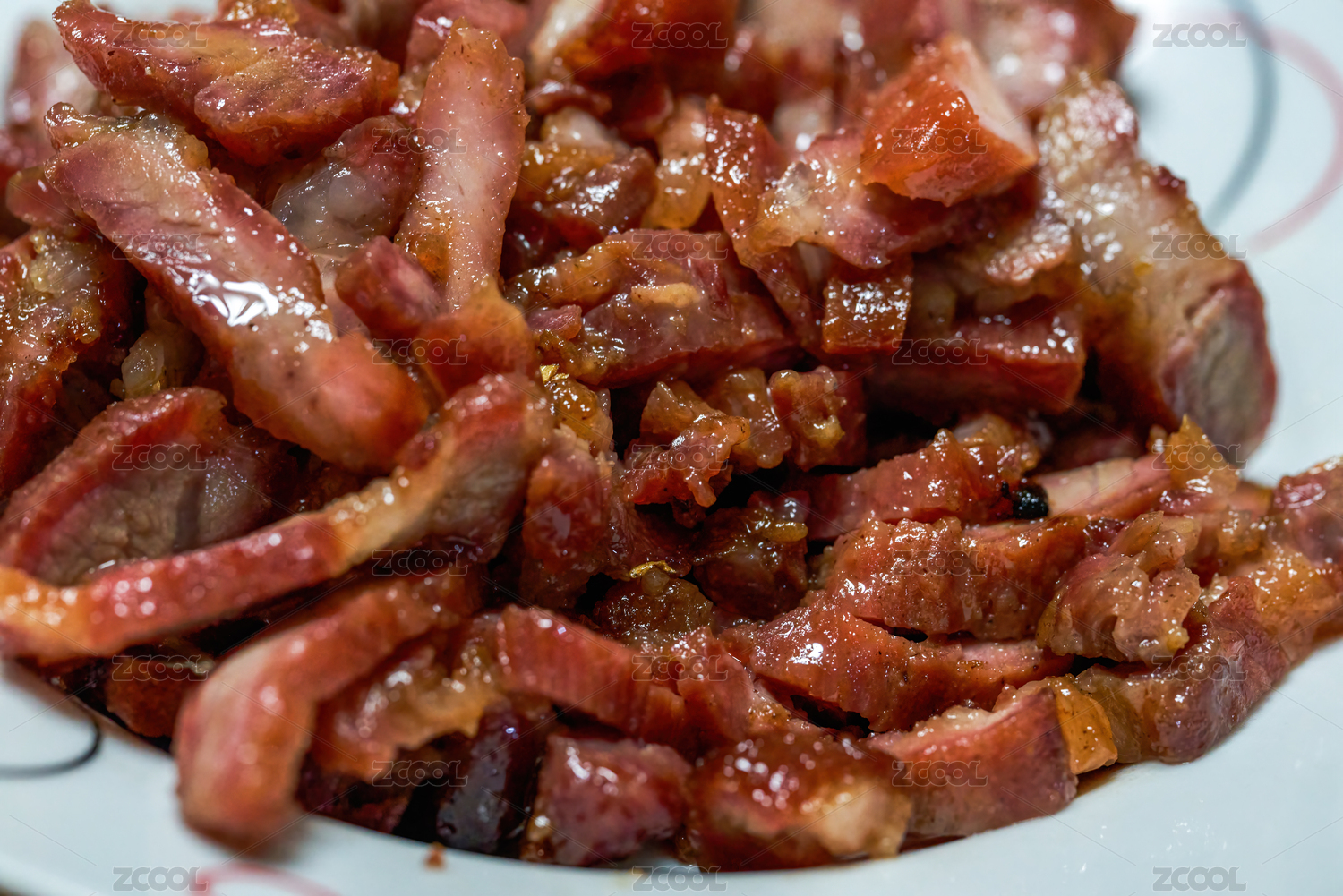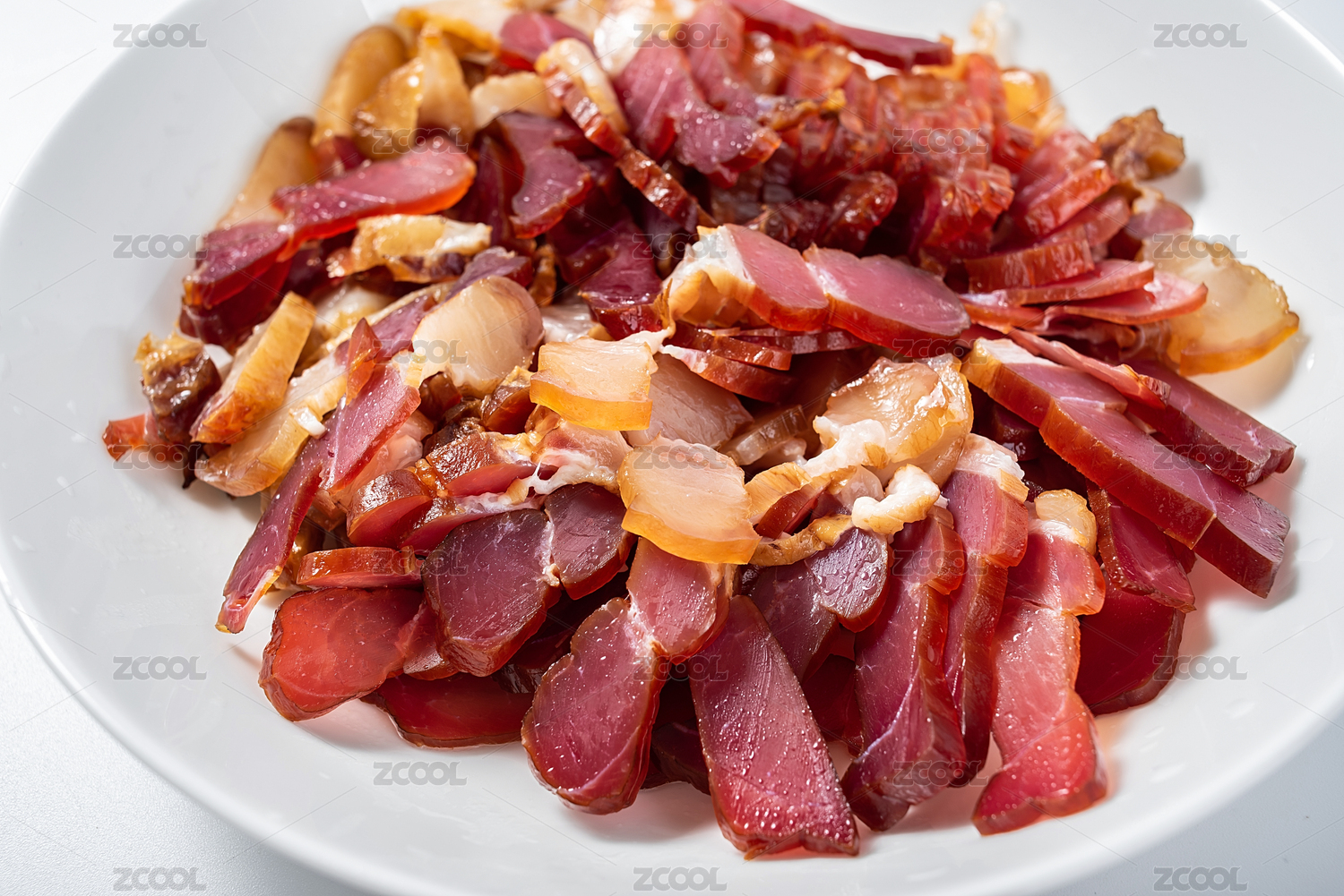 一碟红色湖南湘西烟熏腊肉切片在白背景上