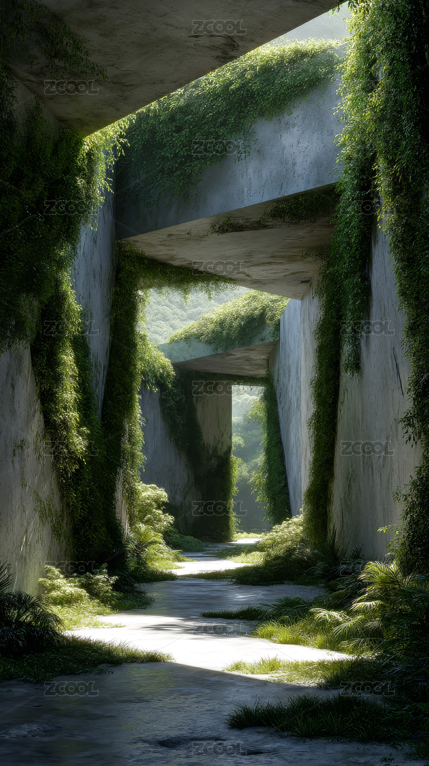 布满藤蔓绿植的混凝土走廊未来科幻生态