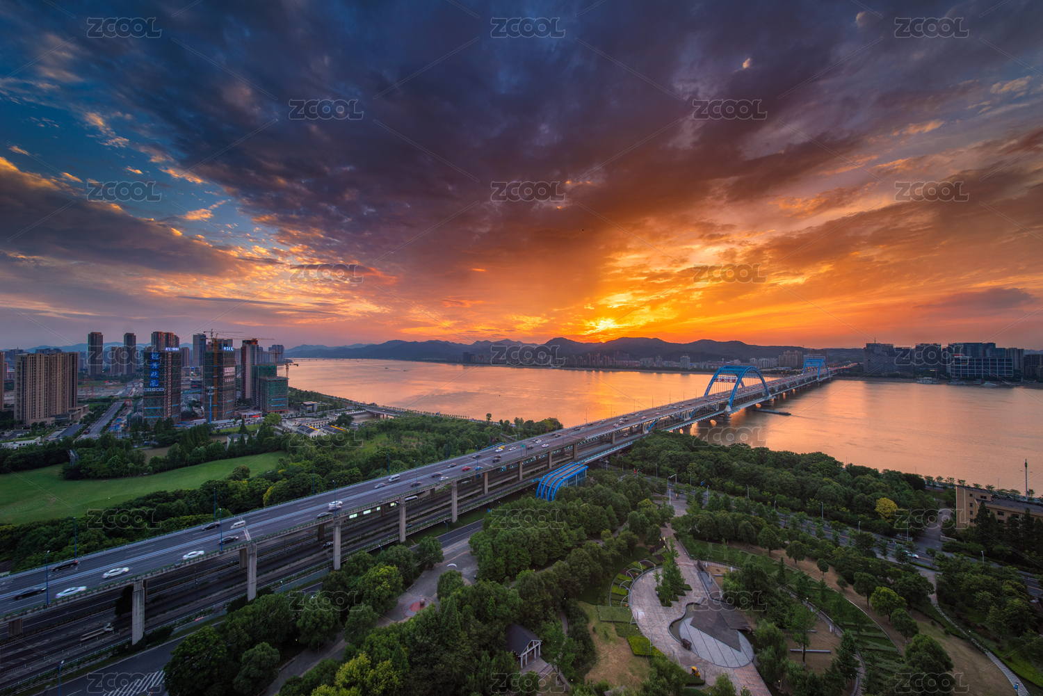 杭州钱塘江畔西兴大桥日落傍晚城市建筑风景