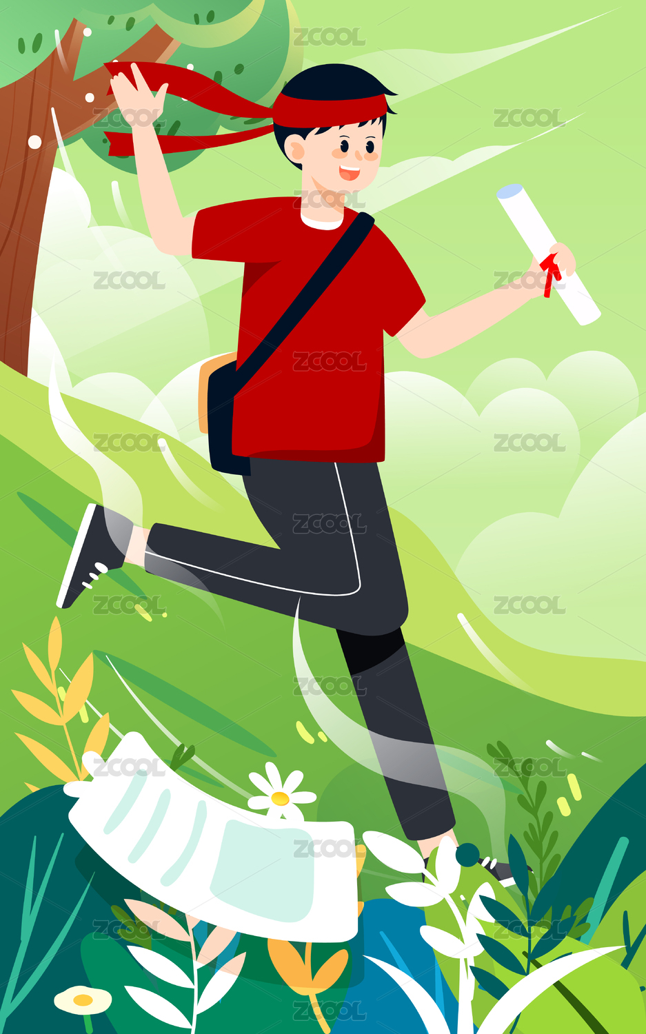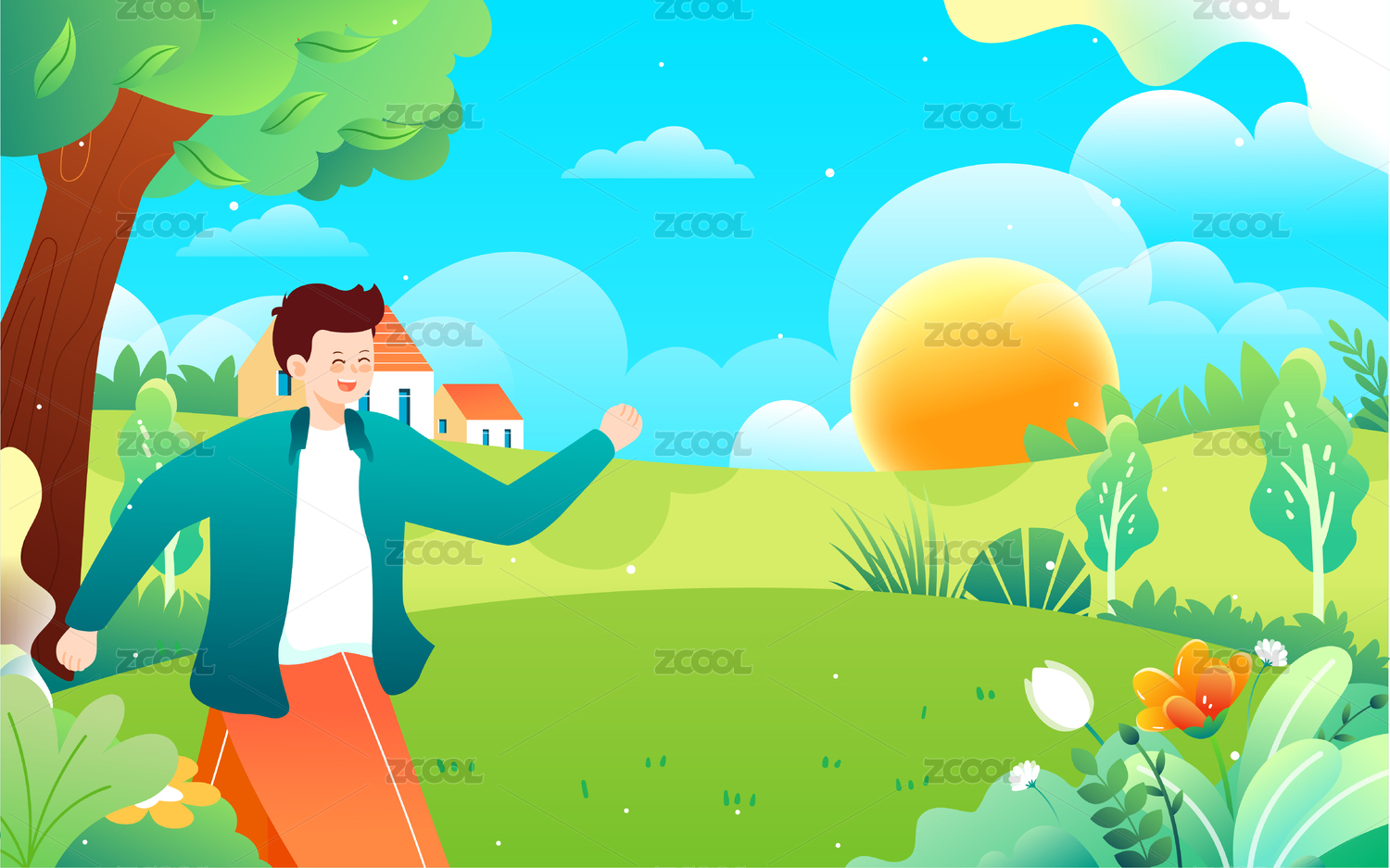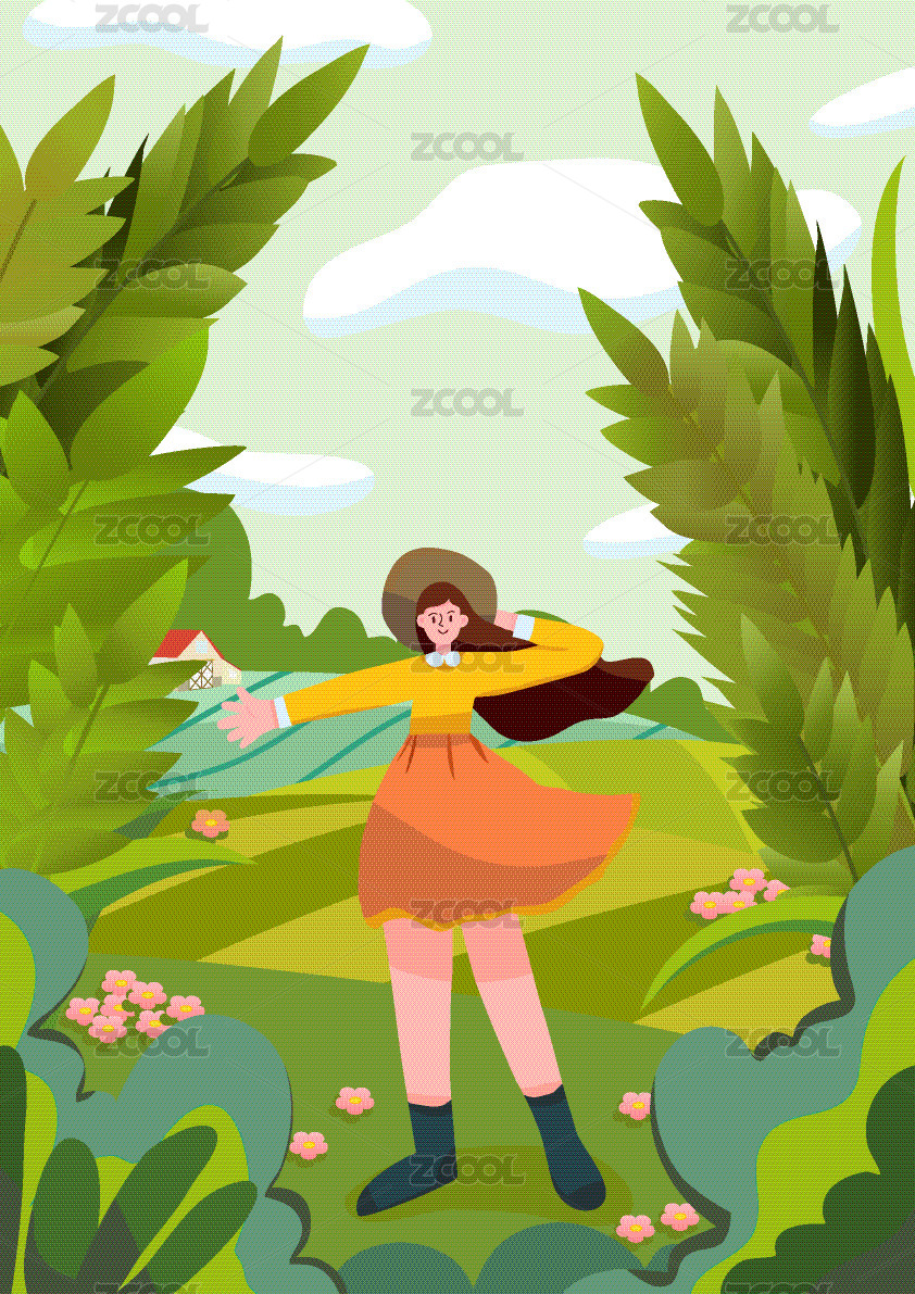 卡通人物夏季踏青旅游登山风景出行矢量插画