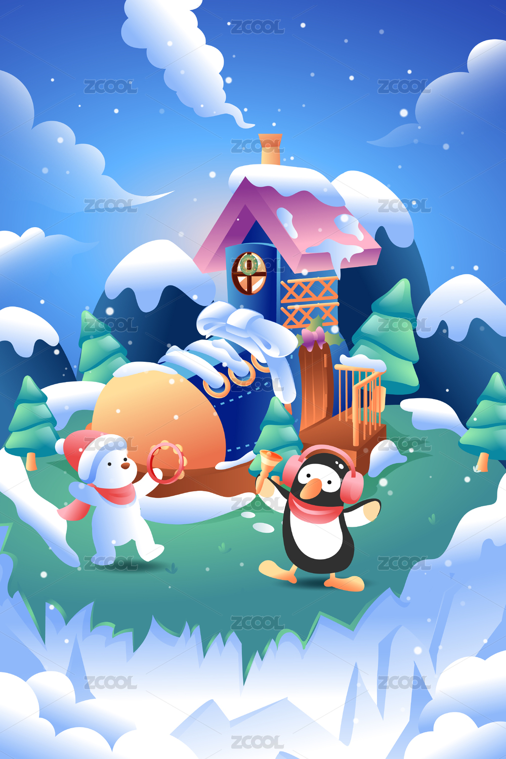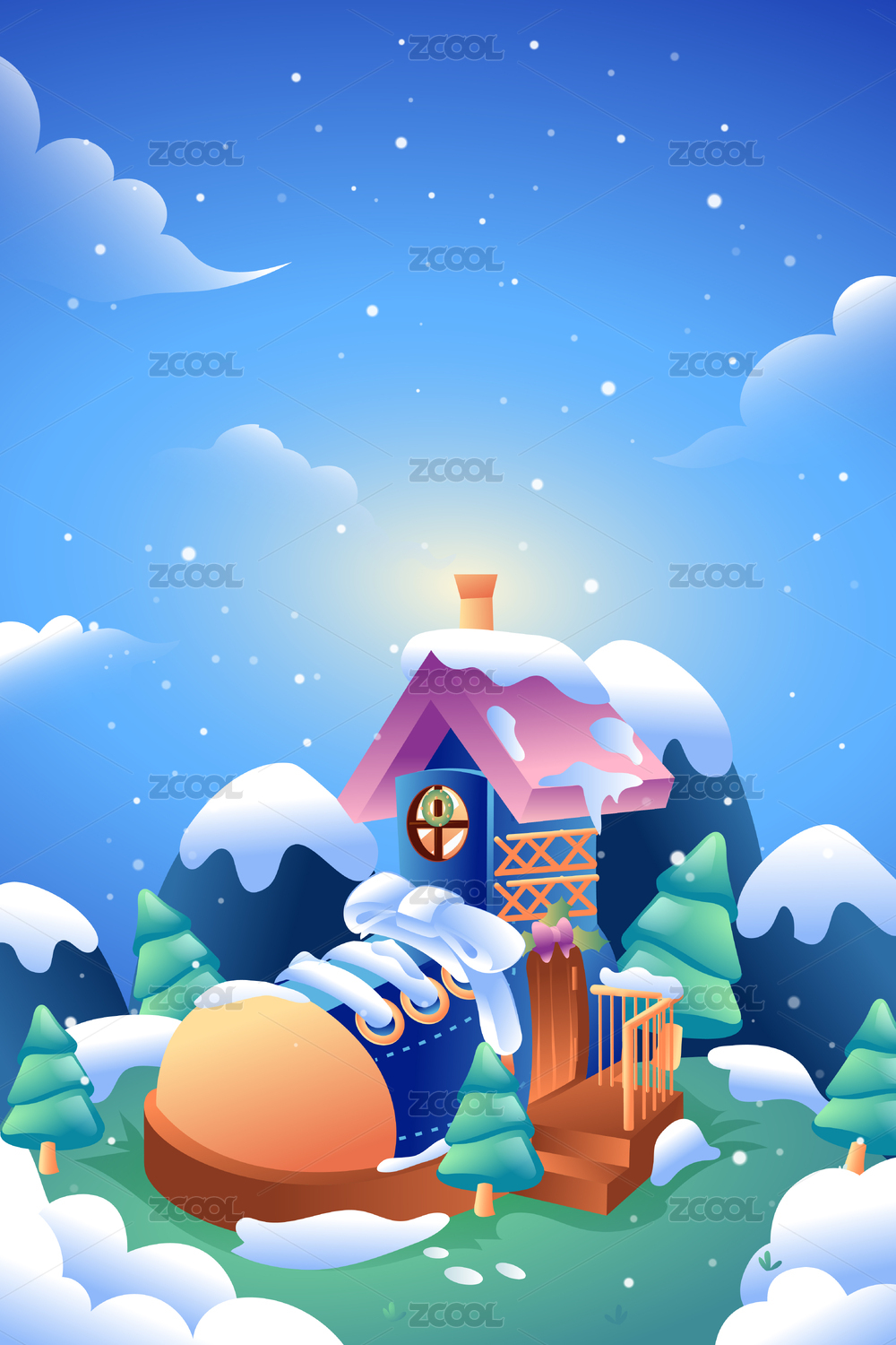 扁平噪点肌理冬季雪屋雪山插画温馨浪漫温暖