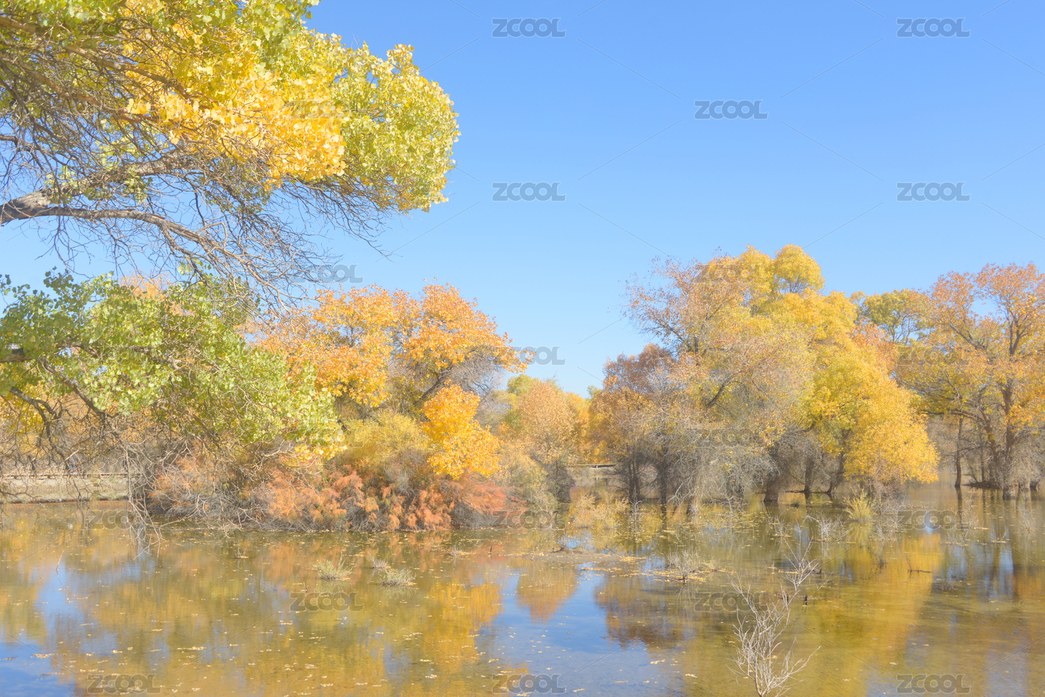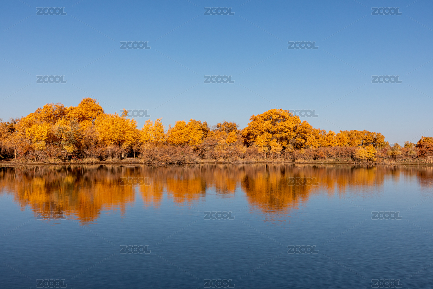 中国甘肃金塔胡杨林 胡杨秋色及湖泊水景