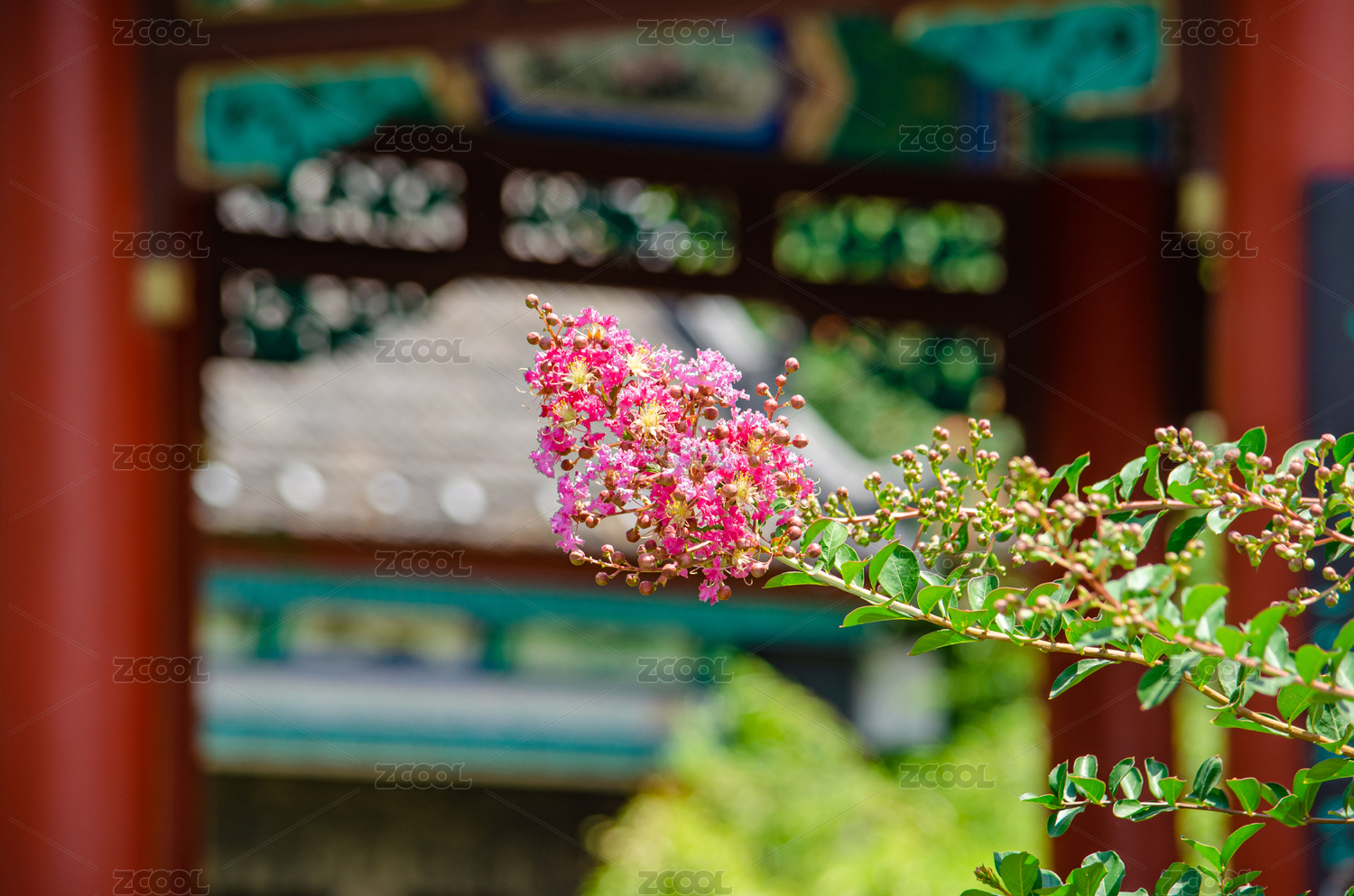 红色中式窗户前的粉色紫薇花,中国山东省潍坊市十笏园