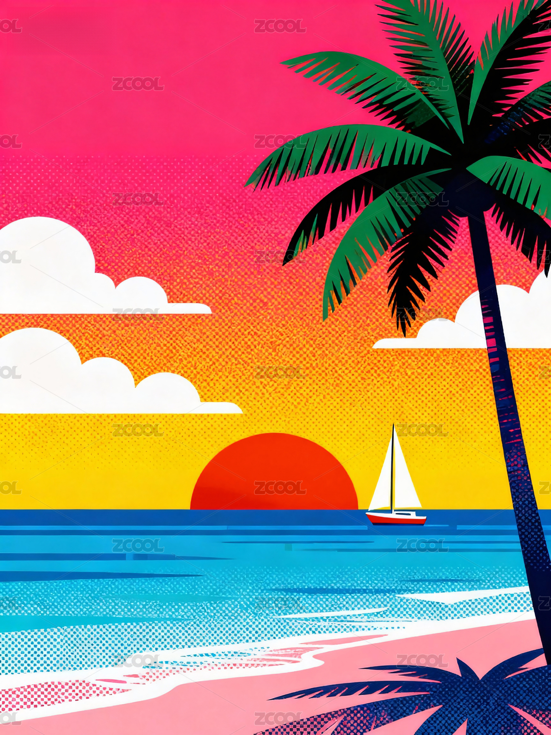 黑底热带海边棕榈树间太阳日落复古3D插画