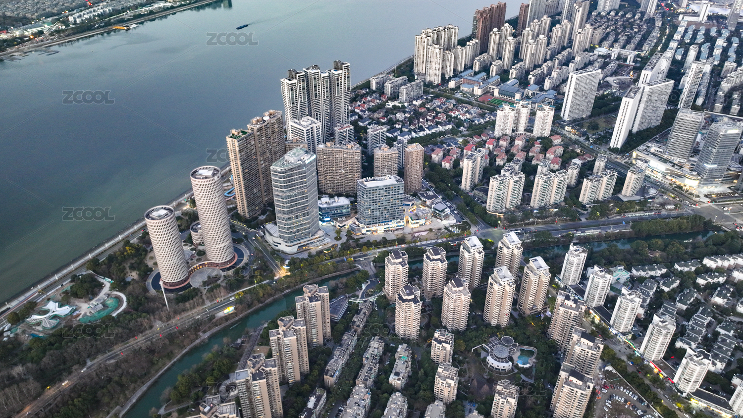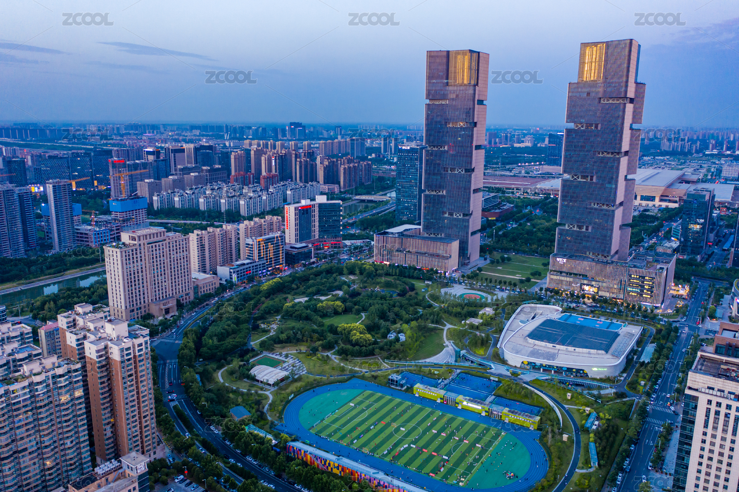 航拍傍晚暮色中郑州郑东绿地双子塔地标建筑