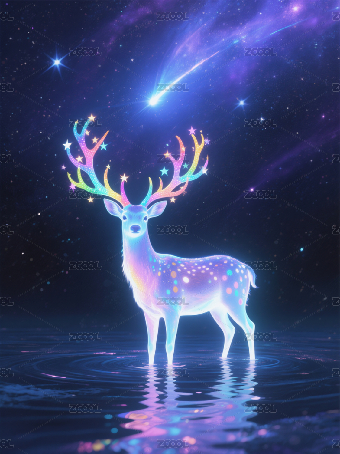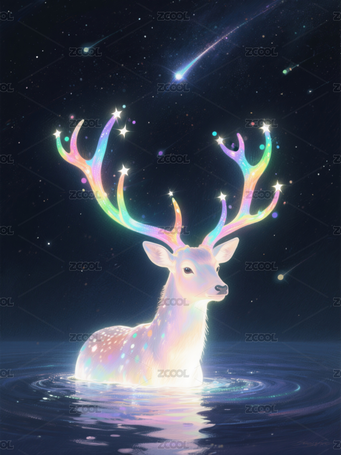 3D渲染国潮风插画梦幻唯美发着光的神鹿