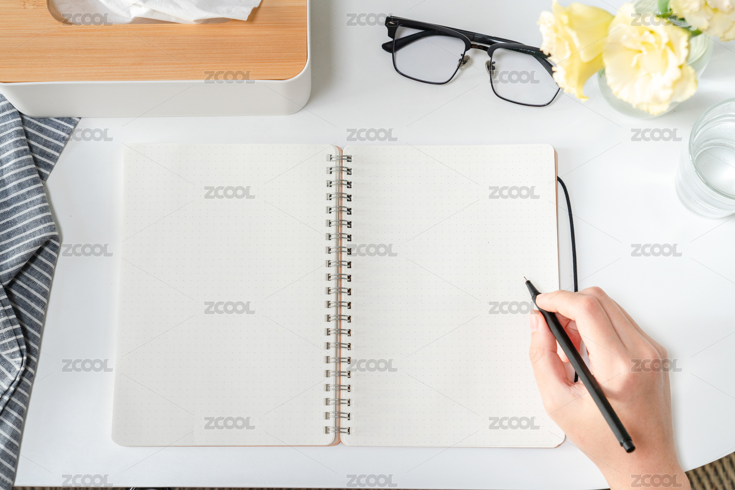 在摆放着眼镜、水杯等物品的桌面上 书写的场景