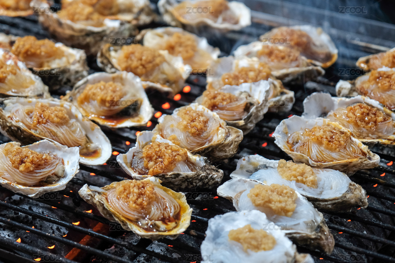 正在烹饪的蒜香烤生蚝整齐的摆放在烧烤炉上