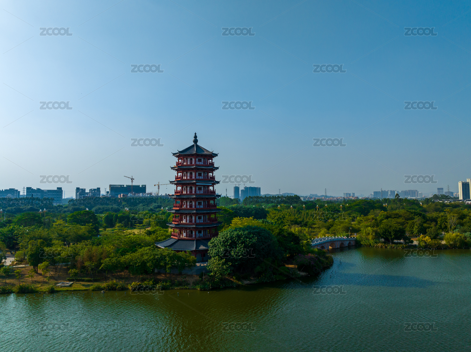 厦门市集美区园博苑古塔与现代城市和谐美景
