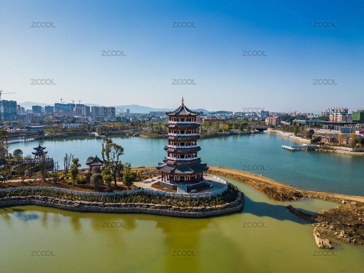 早晨的阳光照射在湖边的古塔上