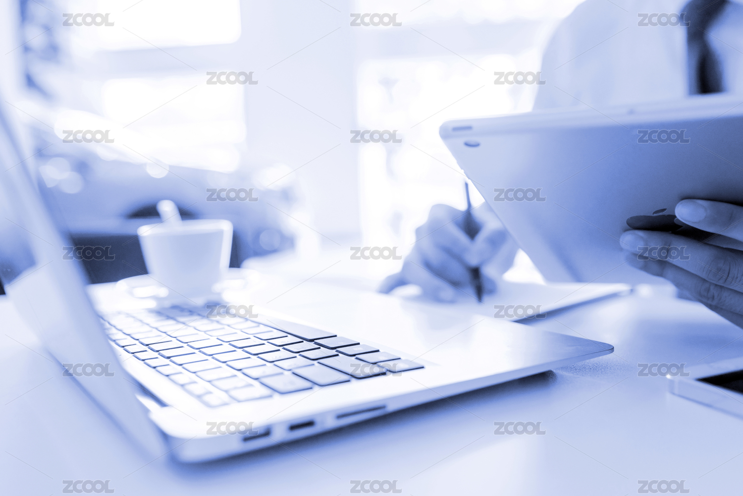 商务人士拿着平板电脑和笔记本电脑交流工作