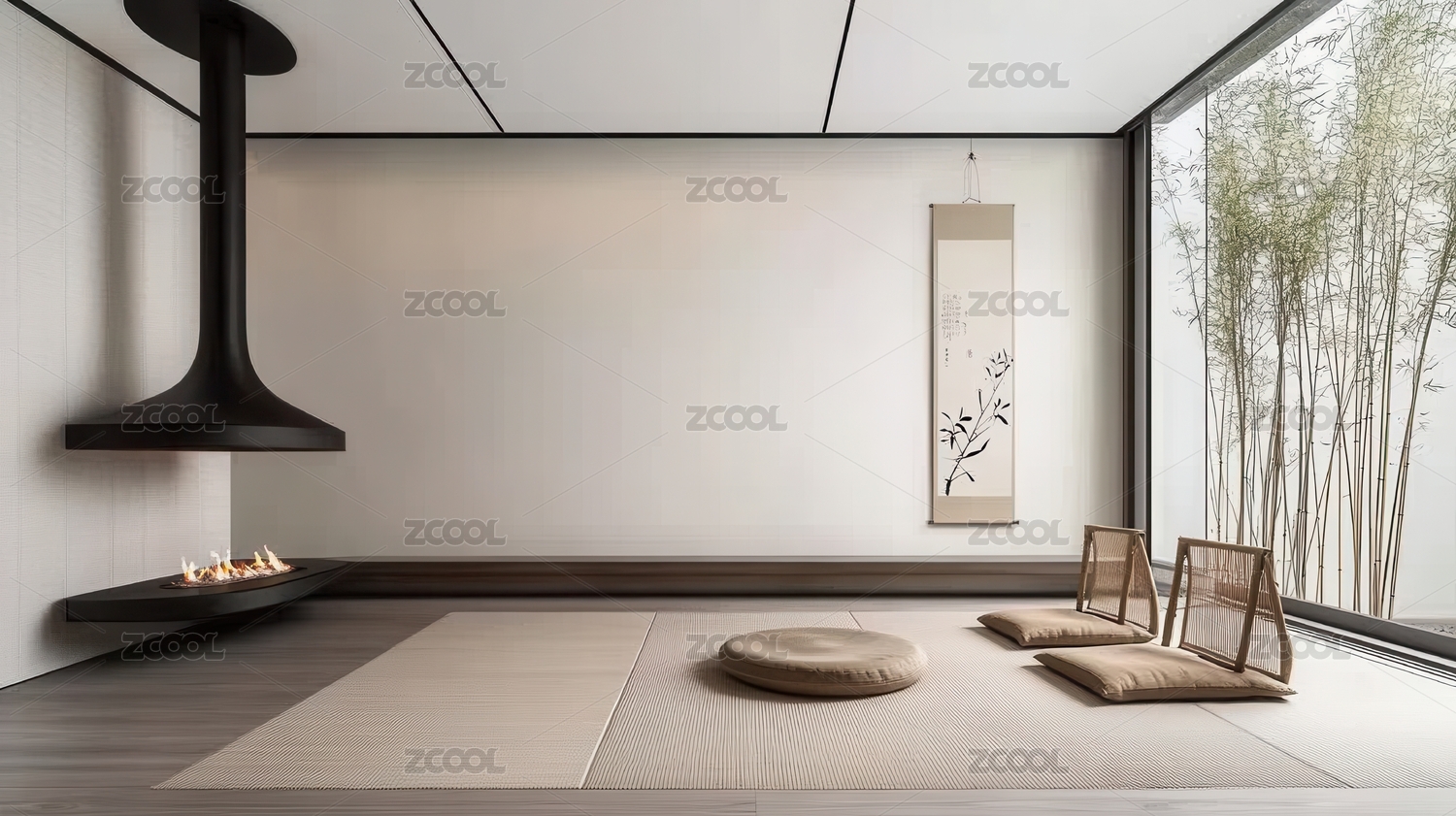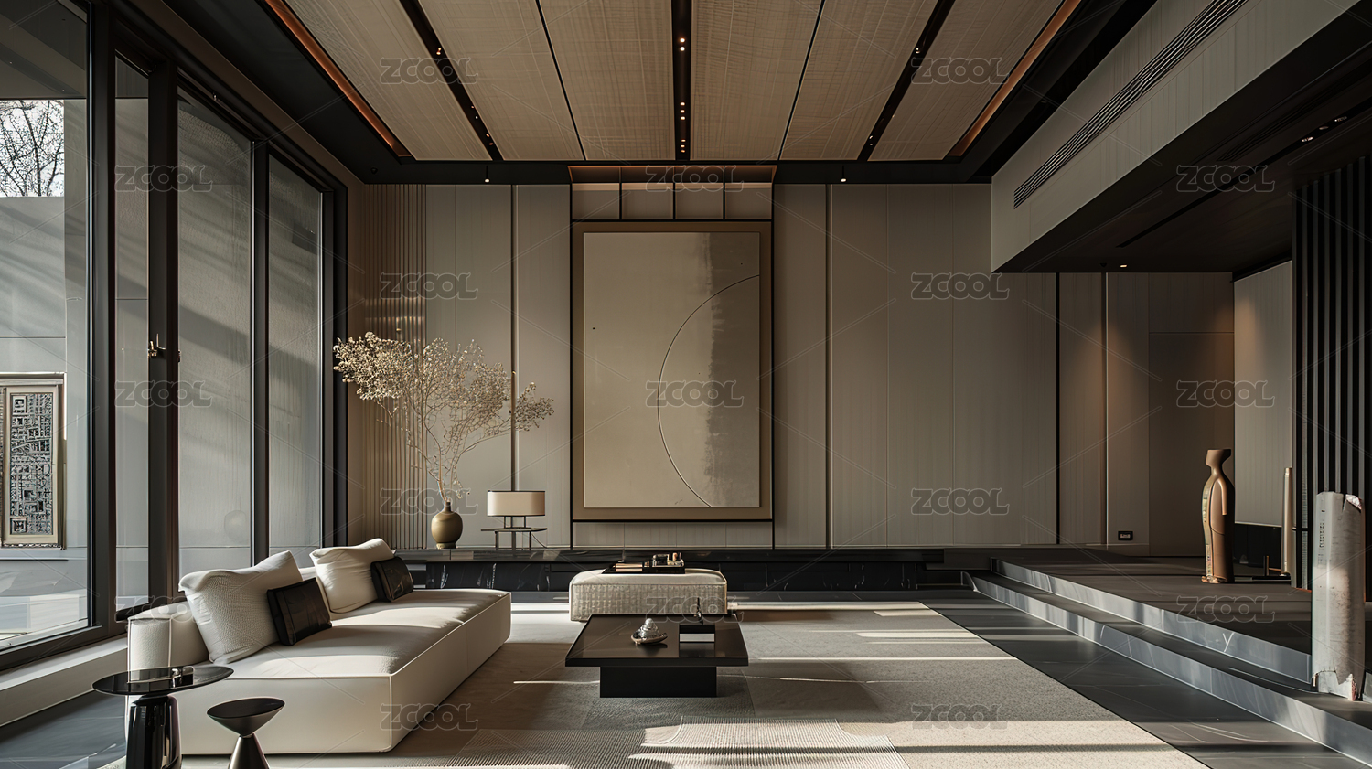 木质元素,榻榻米,浅色调,茶几,落地窗,地台,软垫,自然光,室外景观,温馨灯光