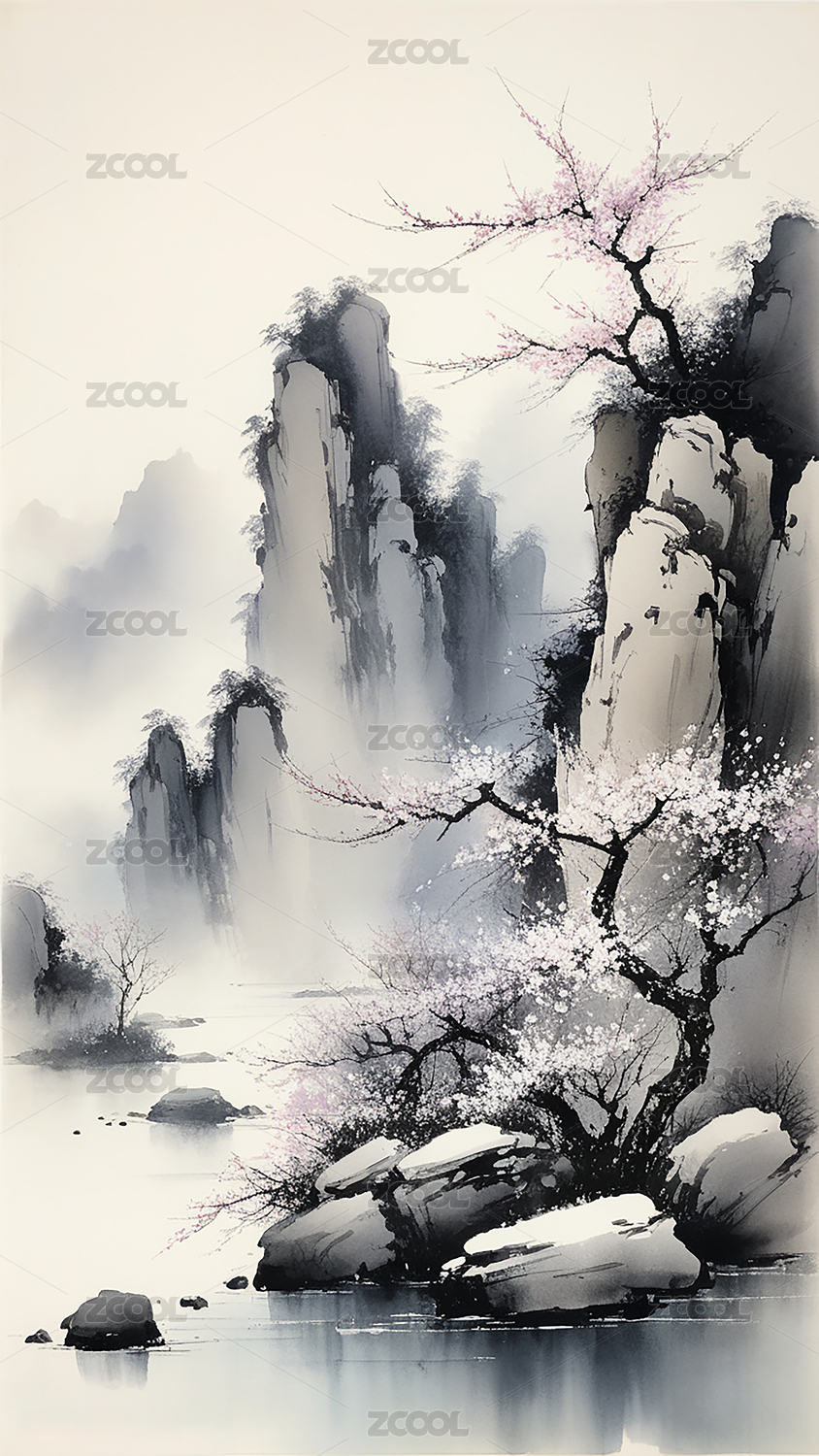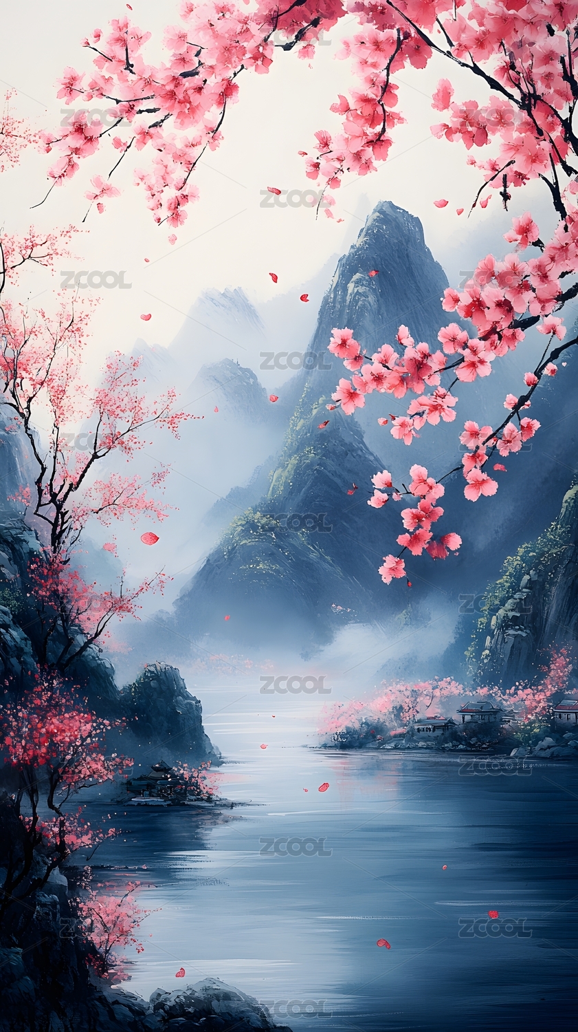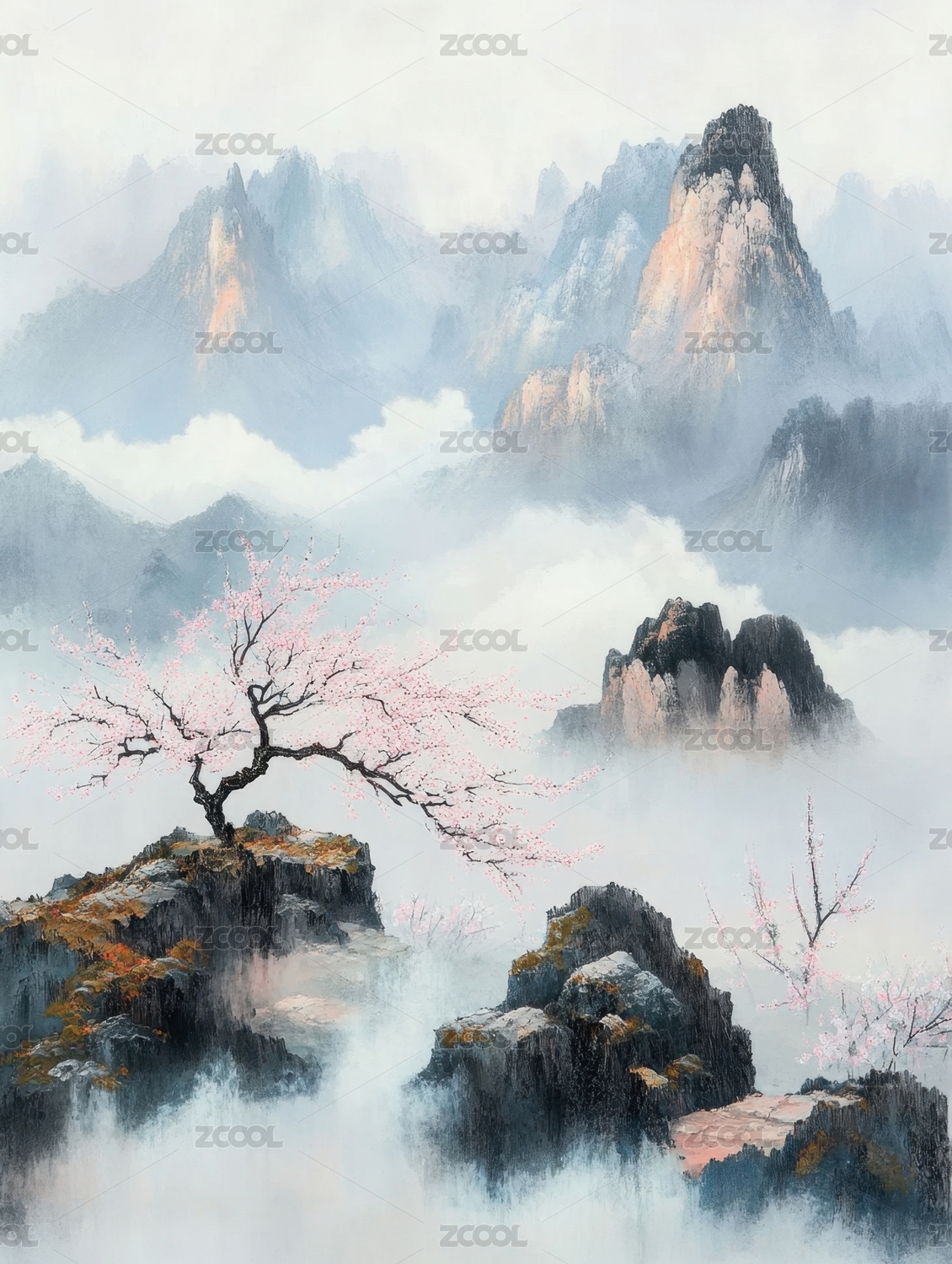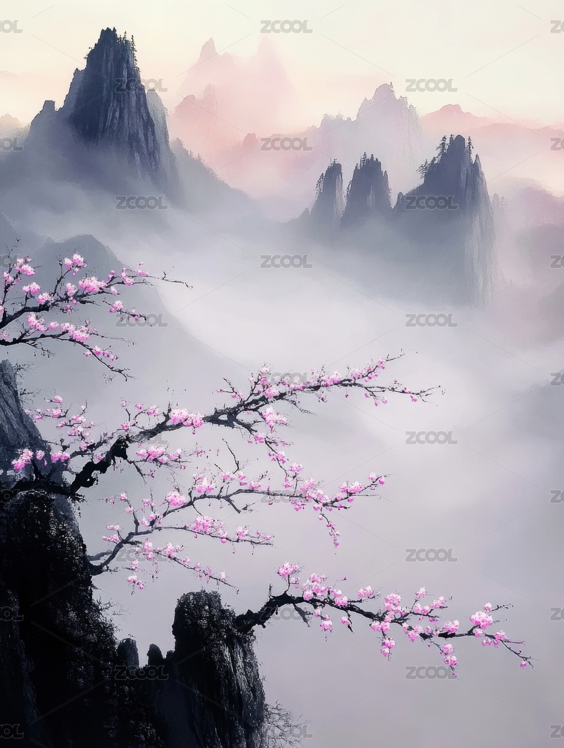 樱花,树木,意境,朦胧,自然,山脉,水墨画,云雾,风景,写意