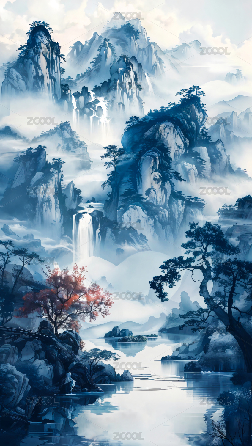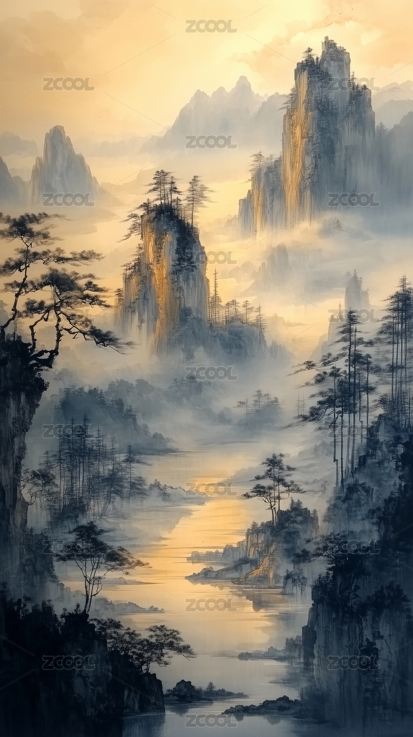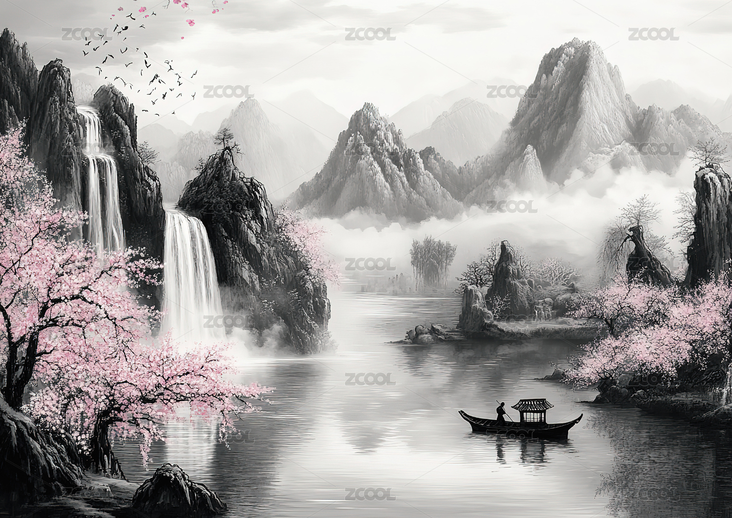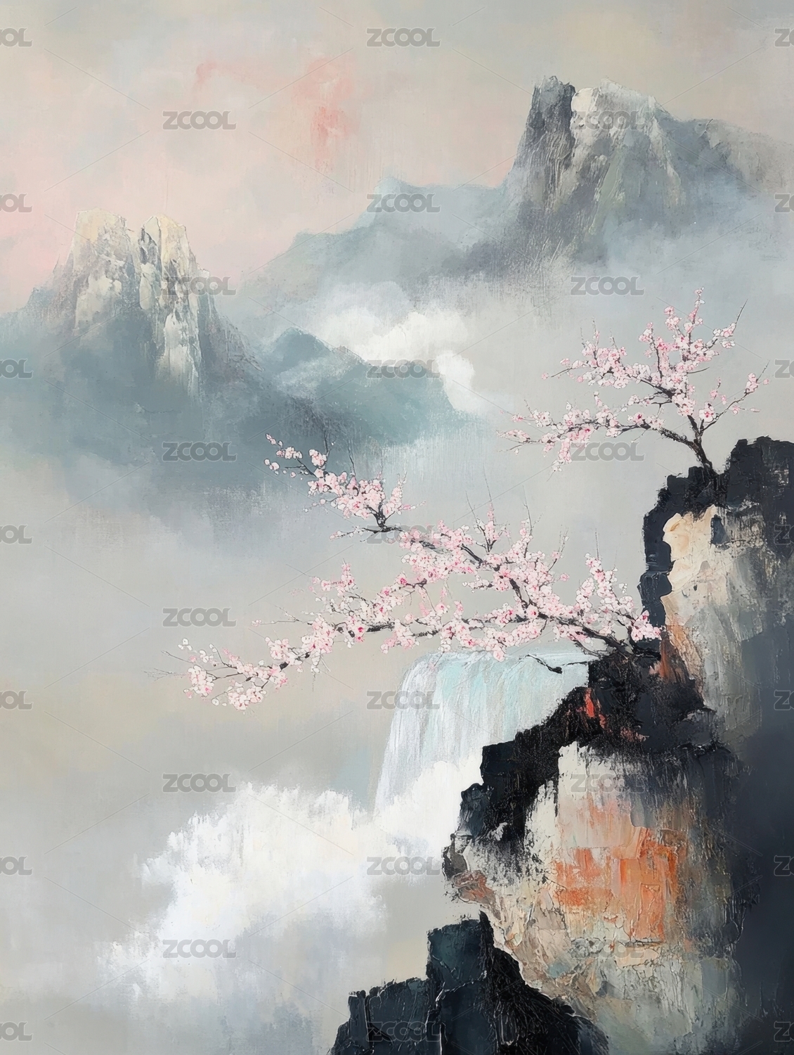 樱花,树木,意境,朦胧,自然,山脉,水墨画,云雾,风景,写意