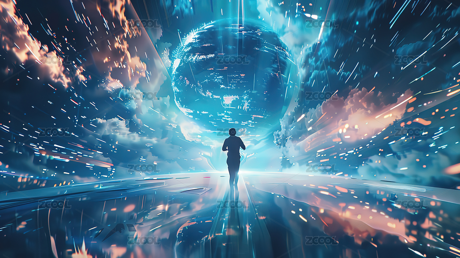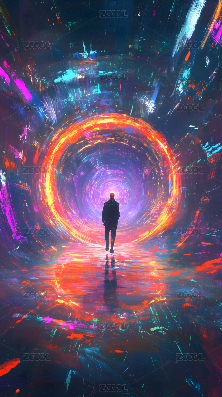 一个人走在神秘的空间隧道