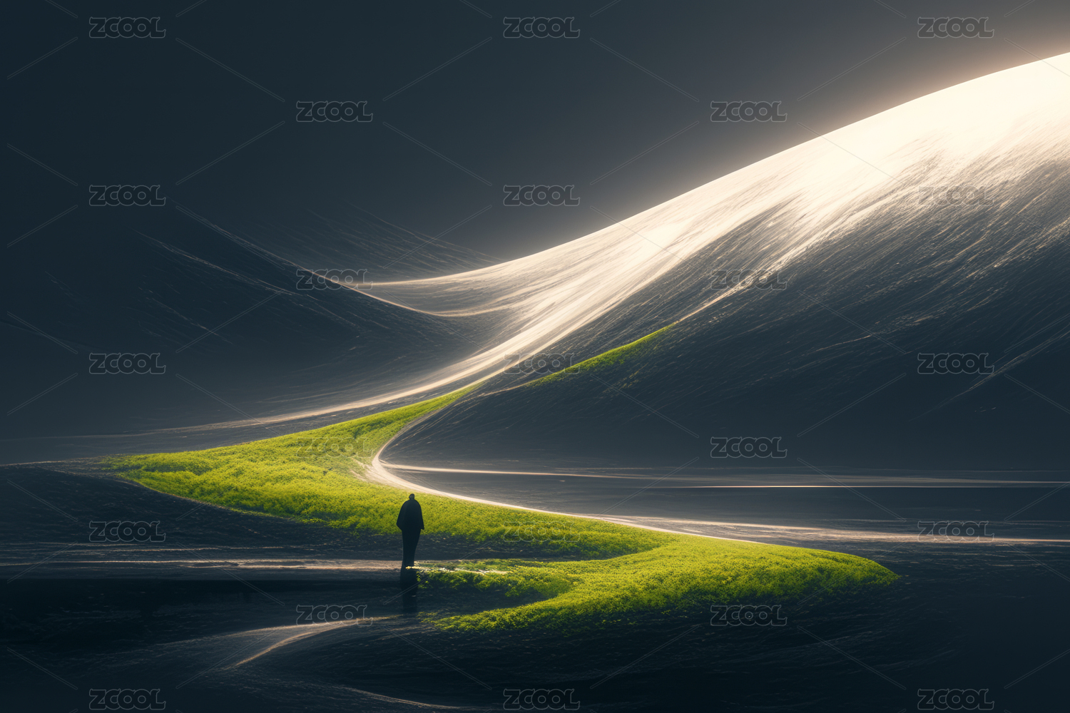 人立于神秘光柱下的奇幻场景