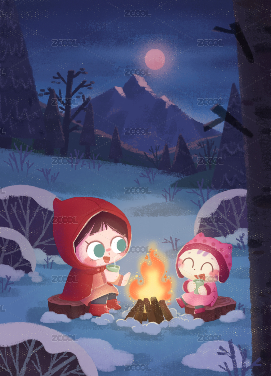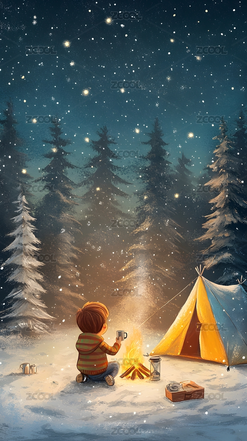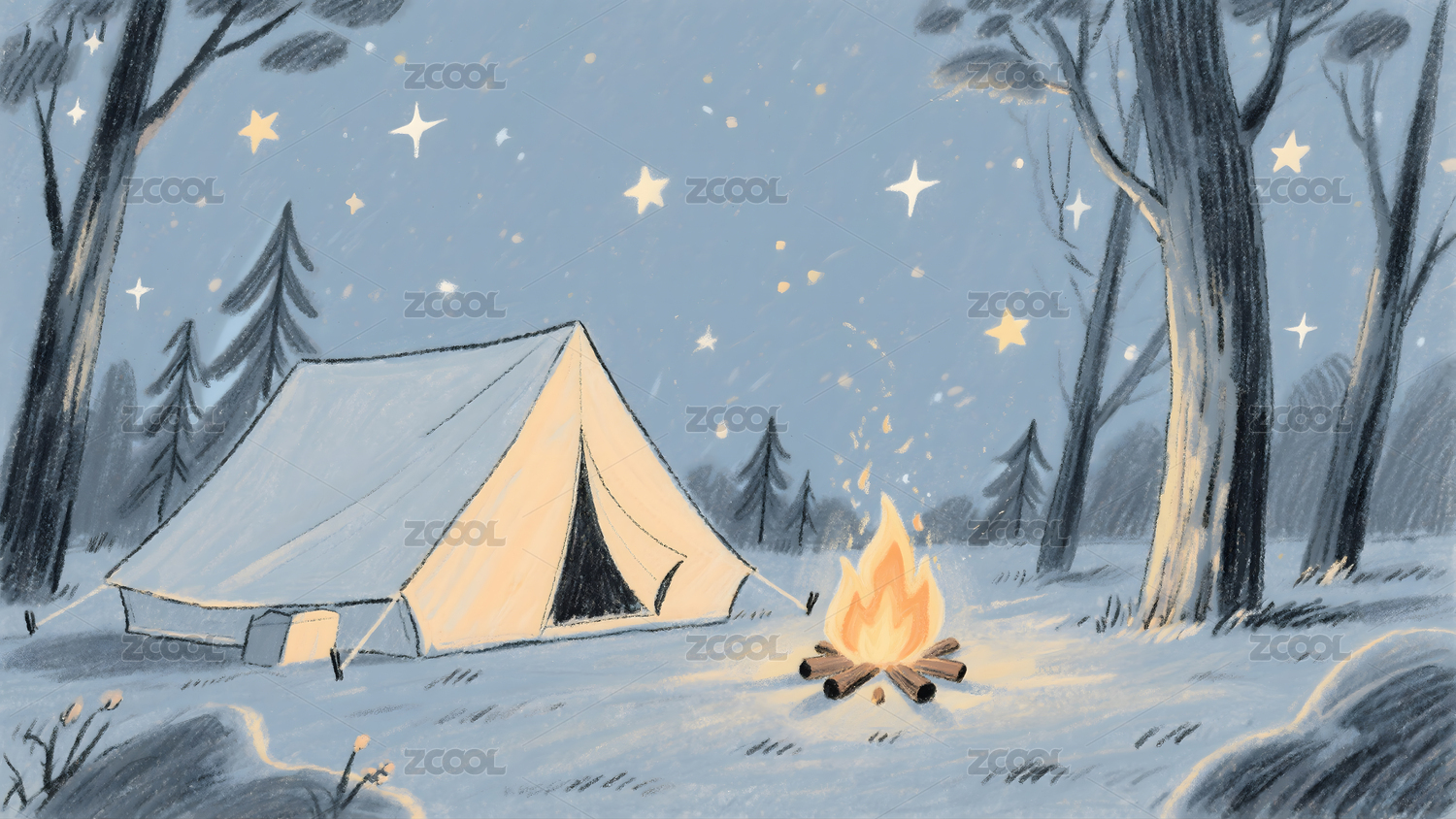 棕色冬季夏令营两个小孩烤火篝火木头帐