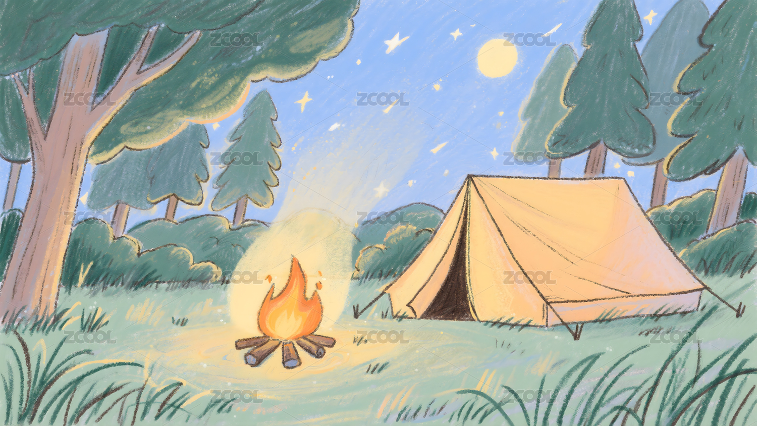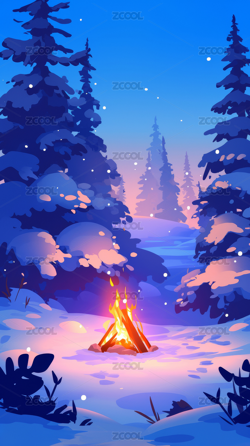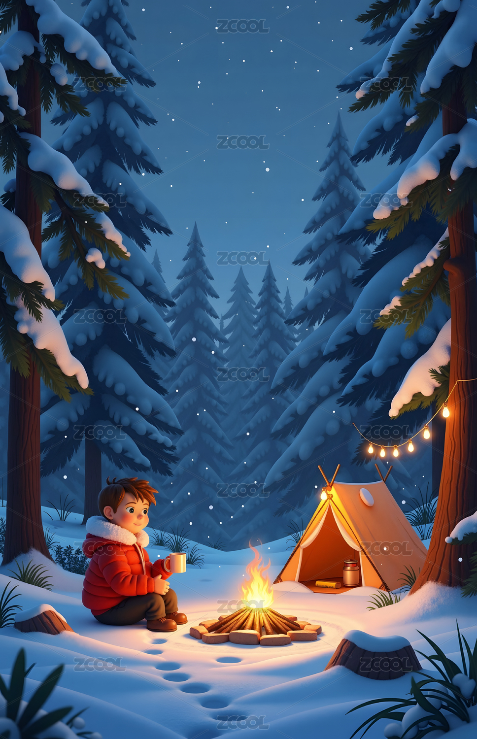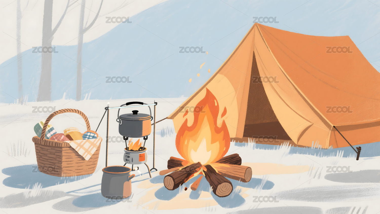 棕色冬季夏令营两个小孩烤火篝火木头帐