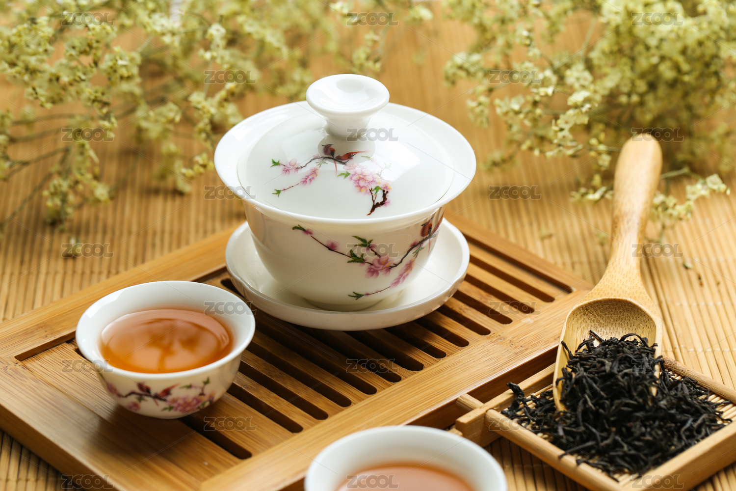 白色瓷器盖碗茶茶杯放在木质功夫茶茶盘上,中国功夫茶冲泡场景
