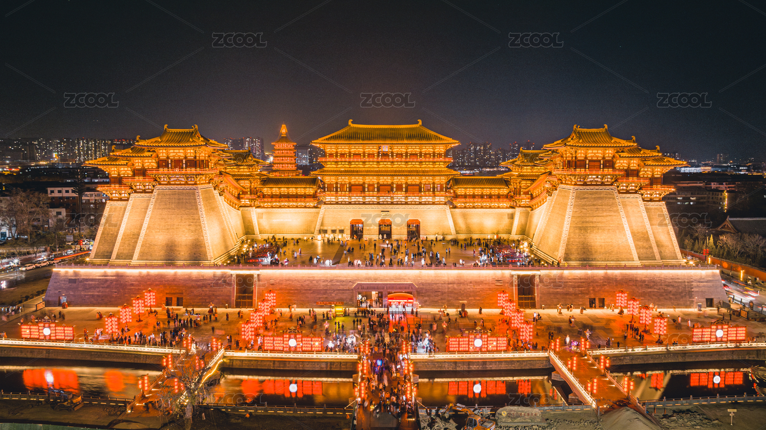 中国河南省洛阳市应天门夜景航拍