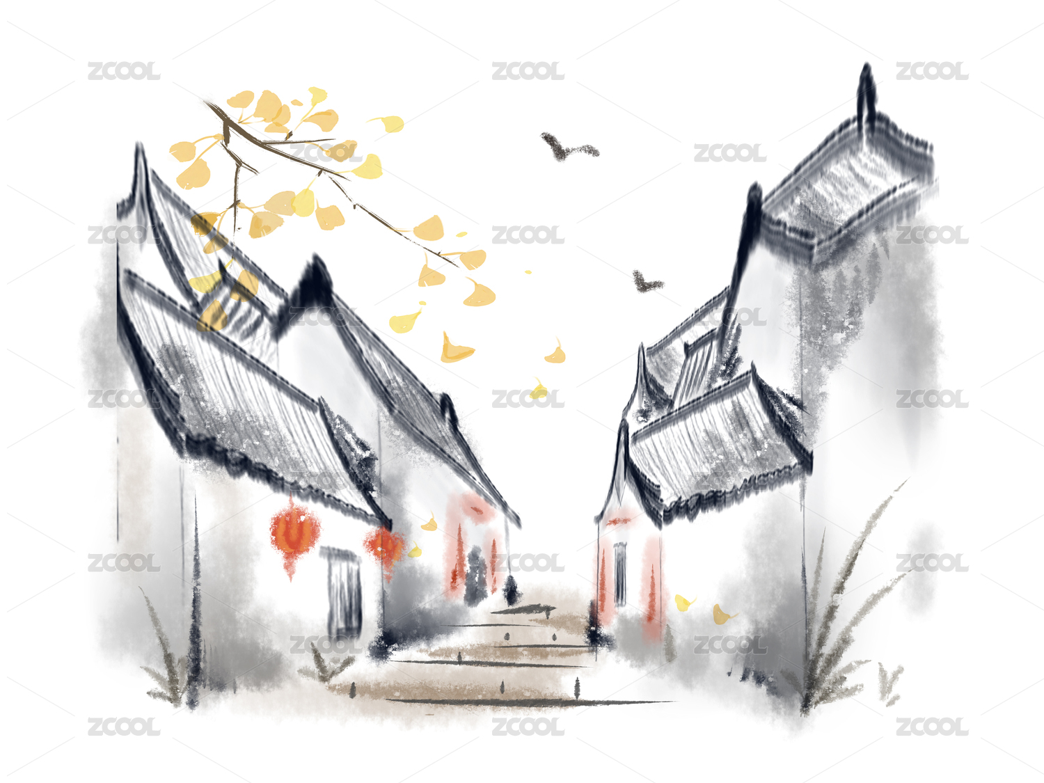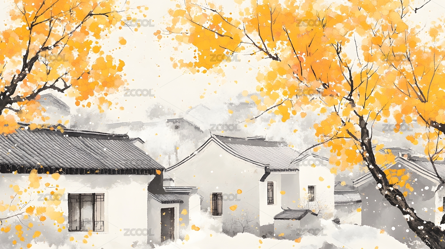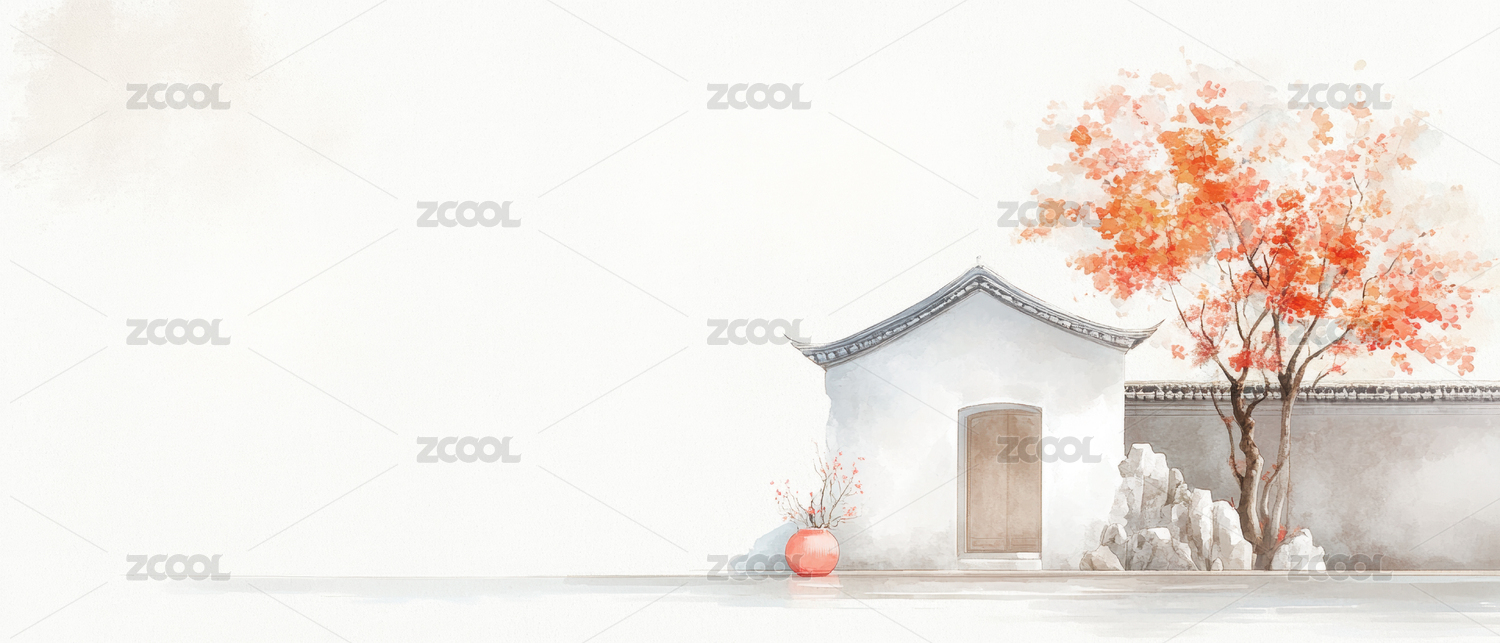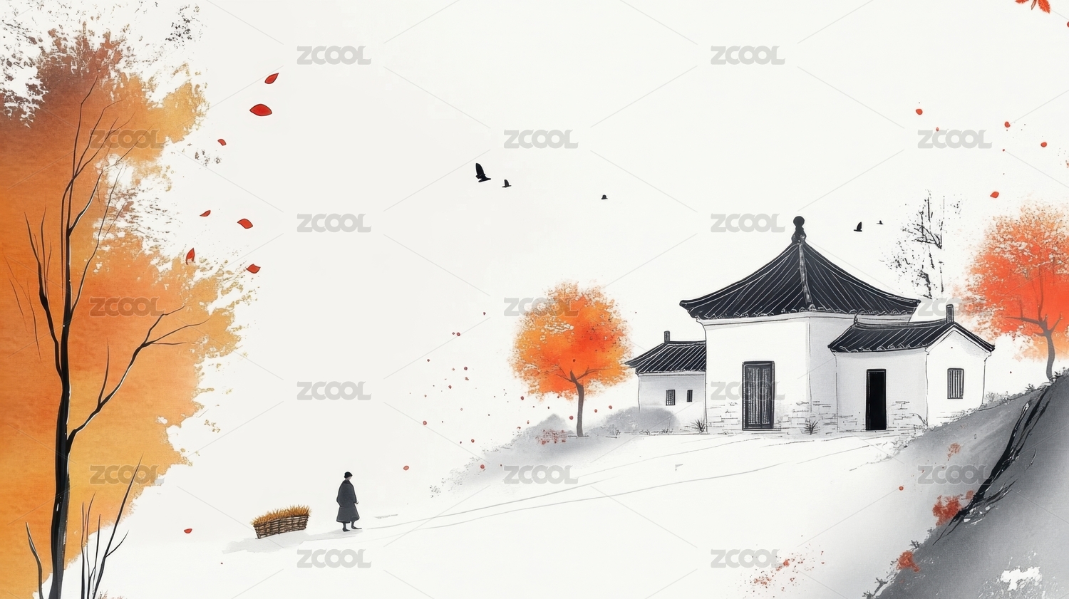 水墨乡村景红树伴白屋